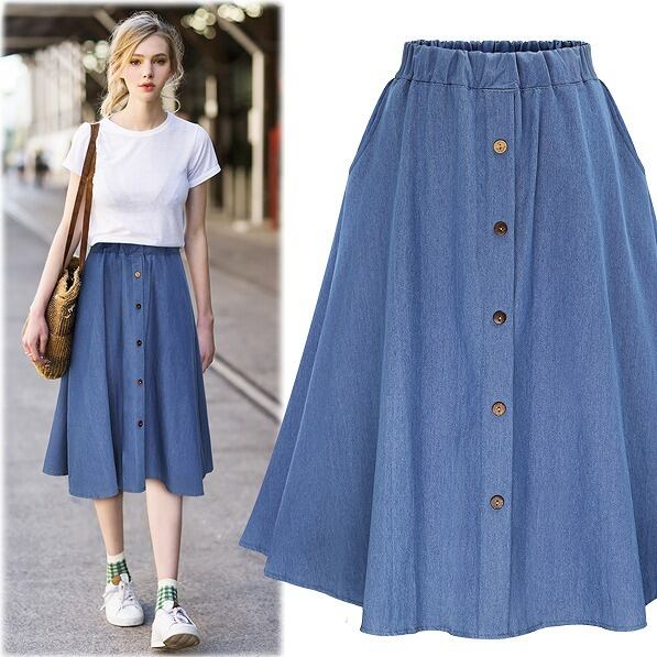 S~大きいサイズ レディース デニムフロントボタンフレアスカート ウエストゴム 春夏 小さいサイズ