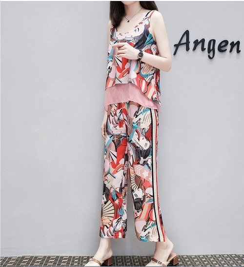 大きいサイズレディース ノースリーブトップス&パンツ セットアップ 上下セット 半袖 五分袖 春夏 キャミソール 和柄