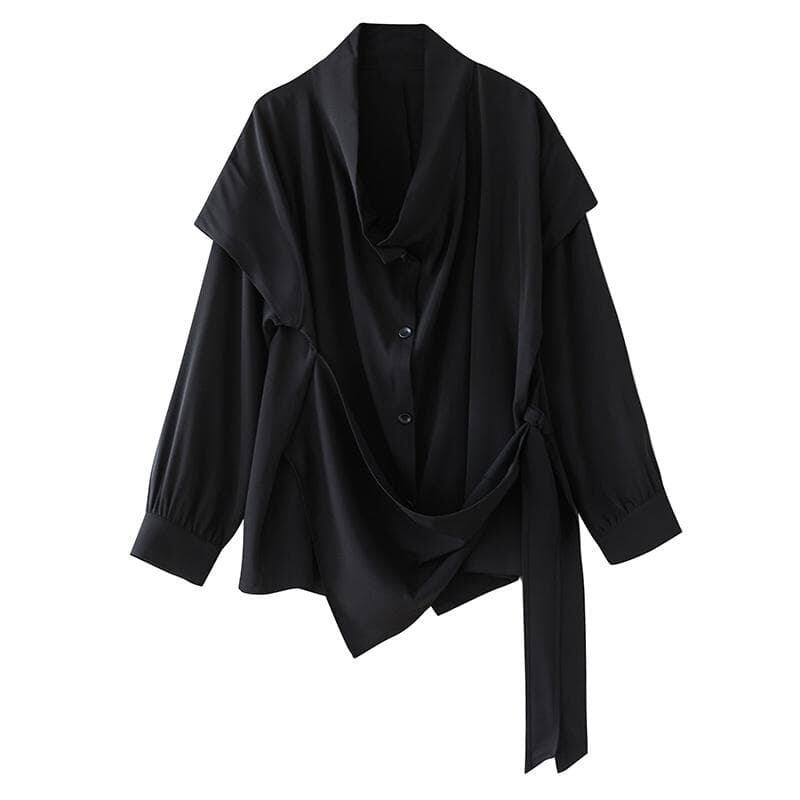 アシンメトリーなデザインとサイドのタイアップ(結び目)が特徴の長袖シャツ。カーディガンとしても着用できる前ボタン仕様です。