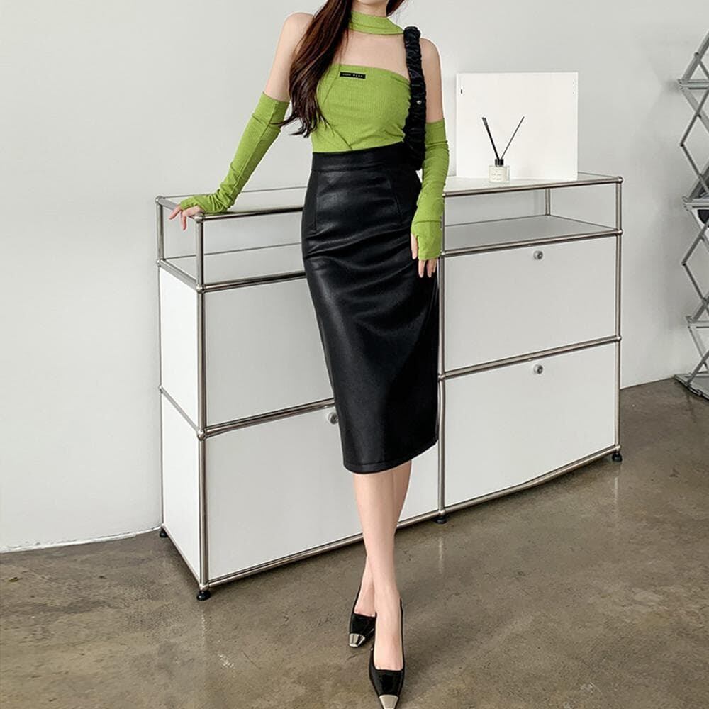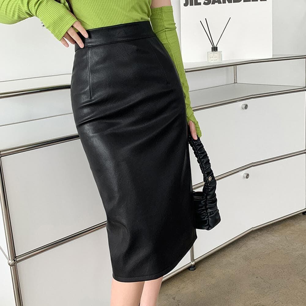 やわらかく滑らかなフェイクレザーを使用、シンプルなPUレザータイトスカート