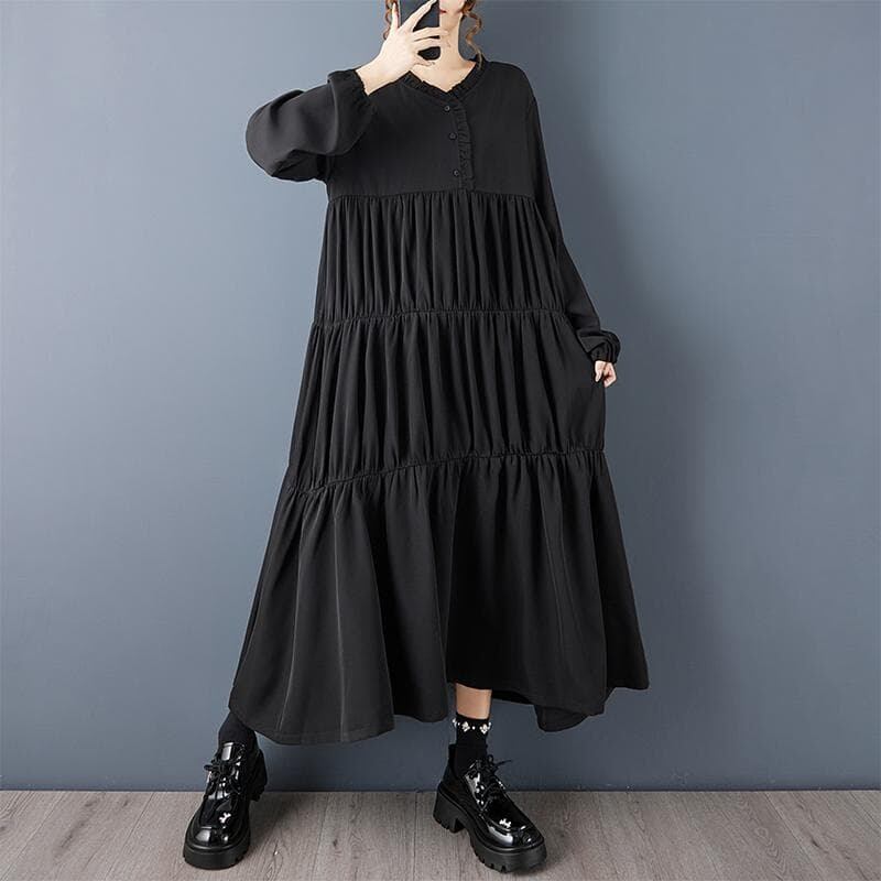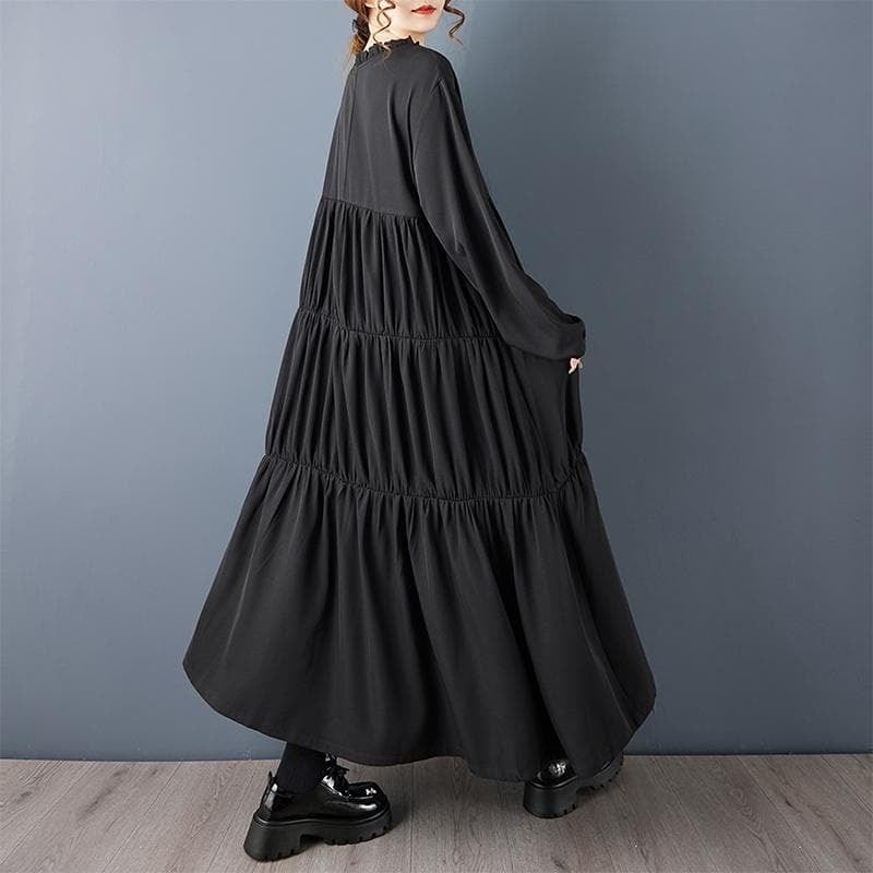 新品 大きいサイズ ゆったり ティアード ワンピース 黒 ロング 春 秋冬 長袖