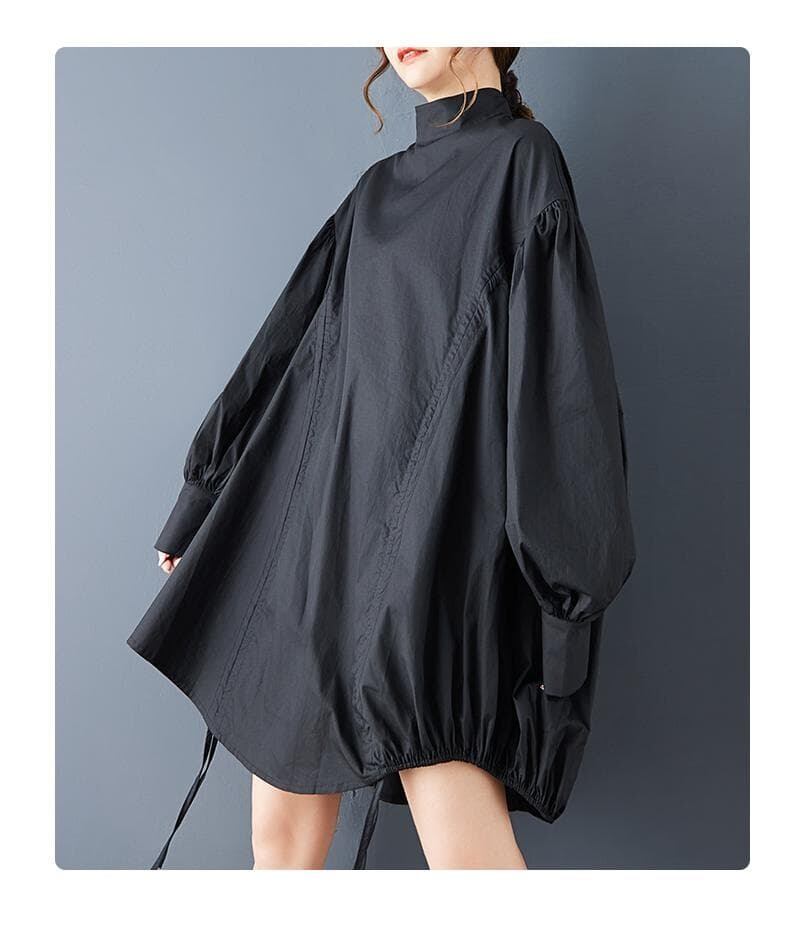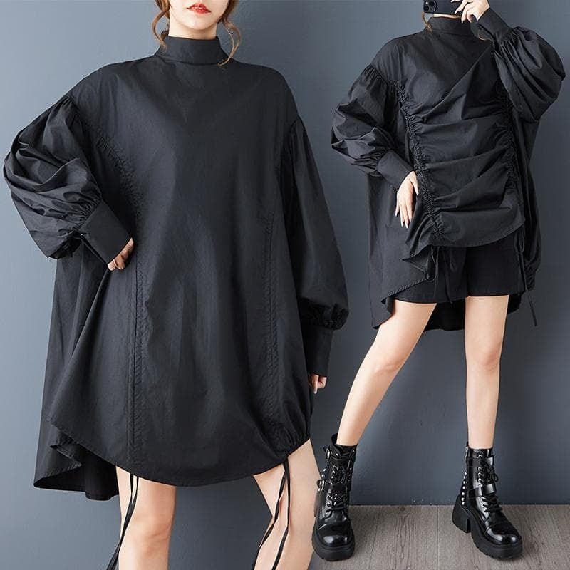 身長160cmの女性の場合の丈感: 着丈86cmは、膝上くらいのミディ丈になります。不規則な裾とフロントのドローストリングによって、丈感やシルエットに変化をつけられるのがポイントです。ゆったりとしたランタン袖(パフスリーブ)で二の腕をカバーしつつ、全体的にモードな雰囲気を演出します。ポリエステル100%でシワになりにくい素材です。洗濯は可能ですが、デザインを保つためネット使用を推奨します。