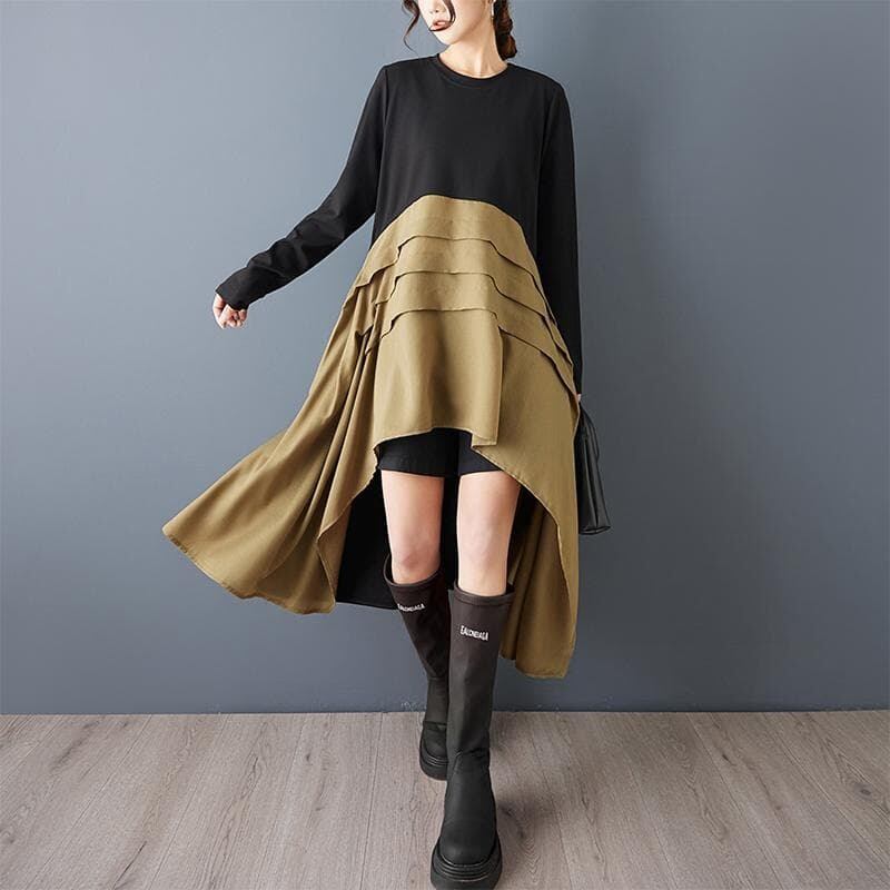 新品 大きいサイズ ゆったり アシメ フリル ワンピース カーキ ロング 春 秋冬 長袖