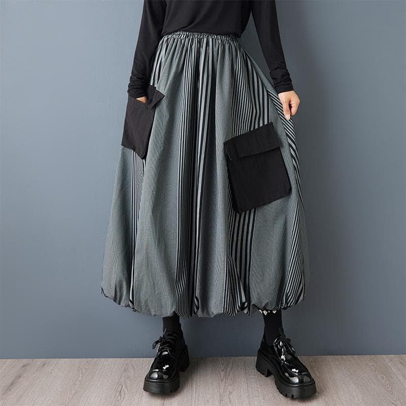 縦のストライプ柄と、大胆に配置された大きなパッチポケット(外ポケット)が特徴的なデザインです。ウエストは伸縮性のあるゴム仕様(ゴムウエスト)でハイウエストになっており、快適な着用感とスタイルアップを両立できます。裾が丸みを帯びたチューリップスカート(バルーンスカート)のシルエットが、個性的な印象を与えます。