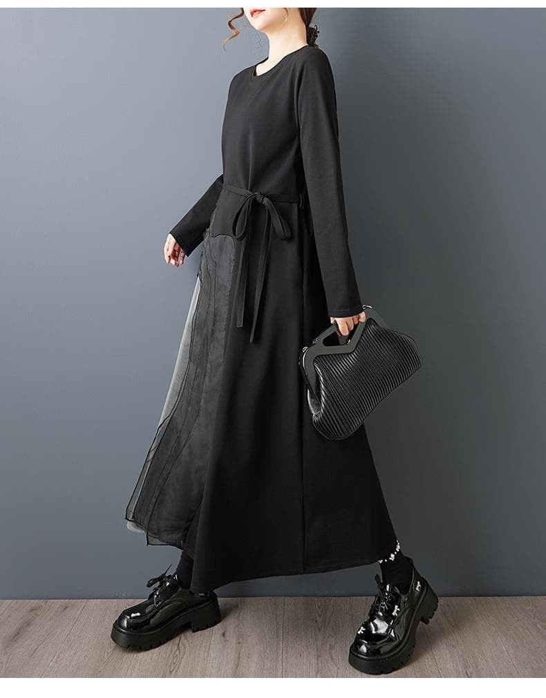 ダークスタイルがおしゃれな長袖ワンピースです。ゆったりとしたルーズフィットで、体型を気にせず着用いただけます。不規則なパッチワークデザインが特徴で、裾や袖にメッシュ素材が大胆に継ぎ合わせ(スプライシング)されており、モードでエレガントな雰囲気を演出します。
