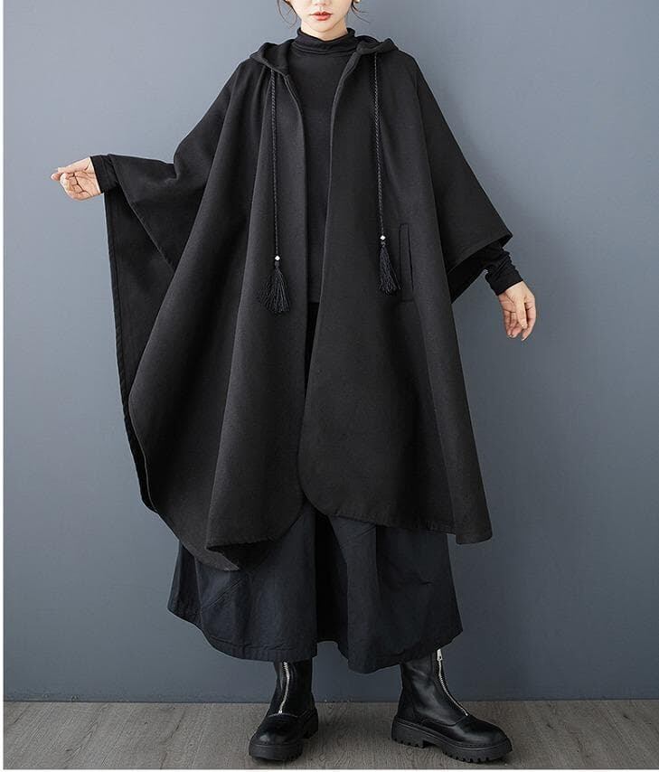 #大きいサイズ #ゆったり #ケープコート #ポンチョ #アウター #フード #タッセル #黒 #ブラック #新品 #秋服 #冬服