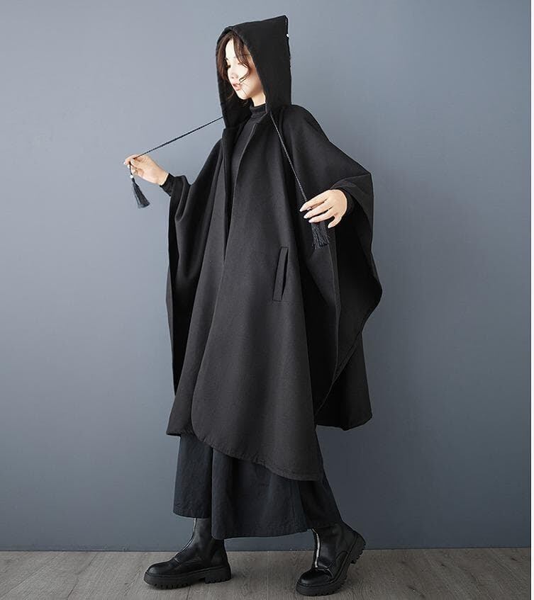 ダークスタイルがおしゃれなフード付きケープコート(ポンチョ)です。ゆったりとしたルーズフィットで、イレギュラーなデザインがモードで個性的な雰囲気を演出します。フードと裾のタッセル(フリンジ)がアクセントになっており、羽織るだけでこなれ感のあるスタイルが完成します。ウールのような厚手の生地で暖かく、秋から冬にかけて活躍するアウターです。