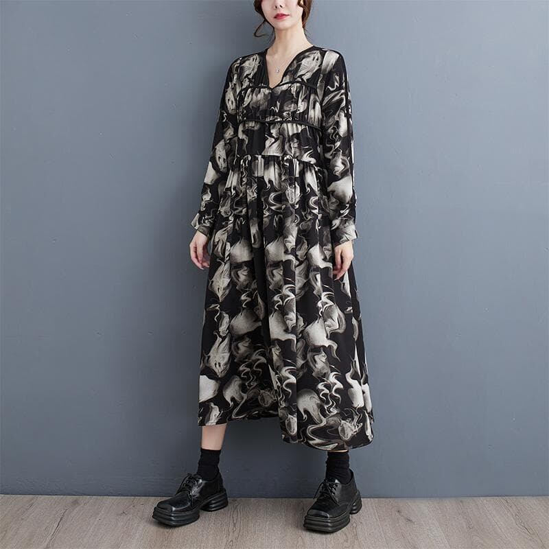 Vネックデザインと抽象的な花柄がクラシカルな雰囲気を演出します。