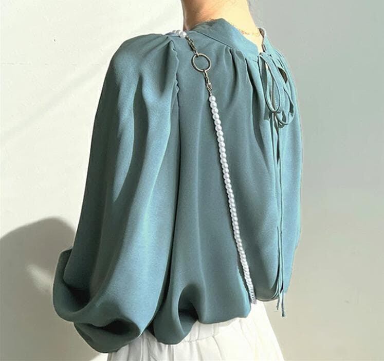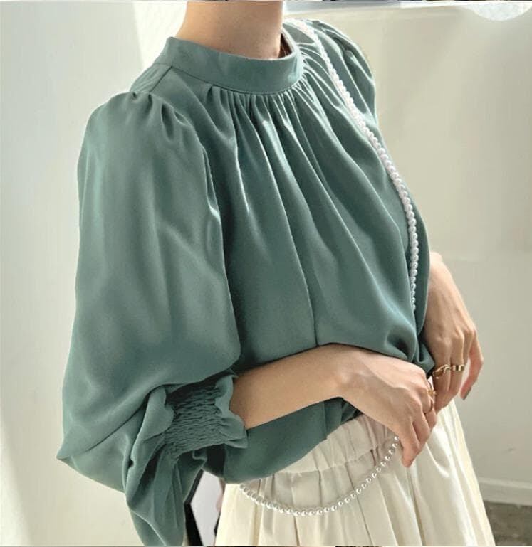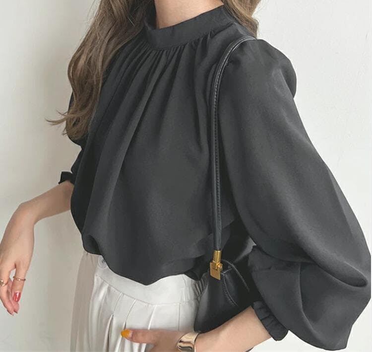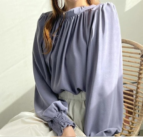 首元にギャザーをたっぷり寄せたクルーネック(スタンドネック)デザインと、ふんわりとしたパフスリーブ/バルーンスリーブが特徴です。 袖口はシャーリングで絞られており、袖のボリューム感を強調しつつ、手首を華奢に見せてくれます。 速乾性のあるシフォン素材を使用しており、シワになりにくいため、お手入れも簡単です。 ゆったりとしたシルエットで、大きいサイズの方にもおすすめです。