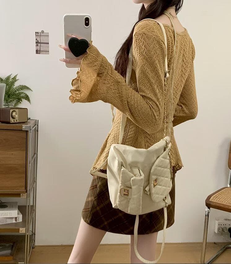 デニムやタイトスカート、ワイドパンツなど、どんなボトムスとも合わせやすい万能トップスです。