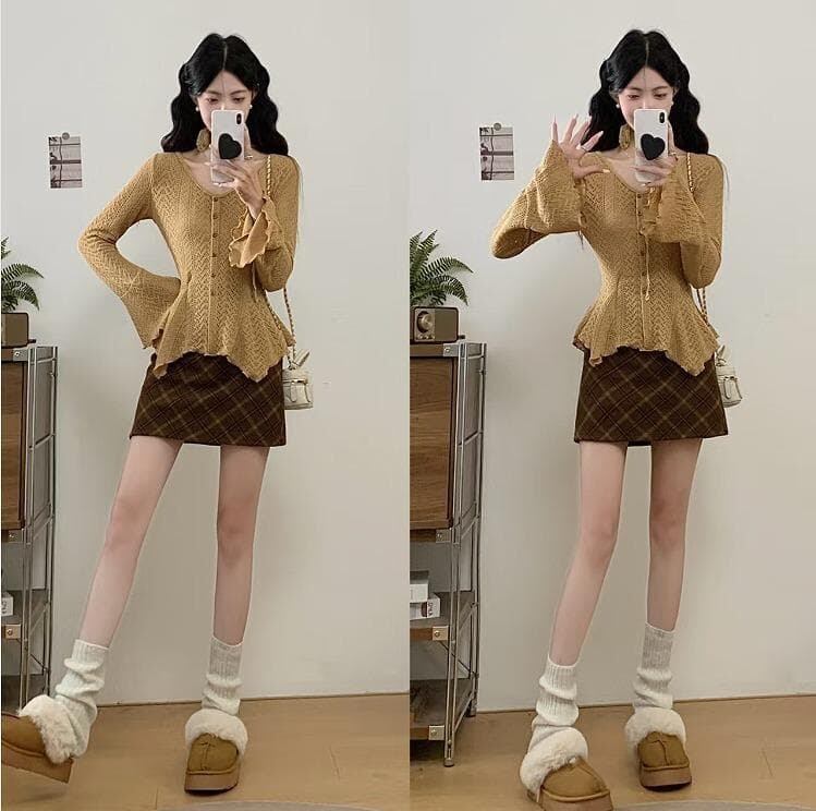 新品の透かし編みフリルスリーブカーディガンです。Vネックとウエストシェイプデザインが女性らしいラインを強調し、アシンメトリーなペプラム裾がエレガントな印象を与えます。優しいキャメル系のカラーで、春から冬にかけて長く着用いただけます。羽織りとしてもトップスとしても活躍する優秀アイテムです。