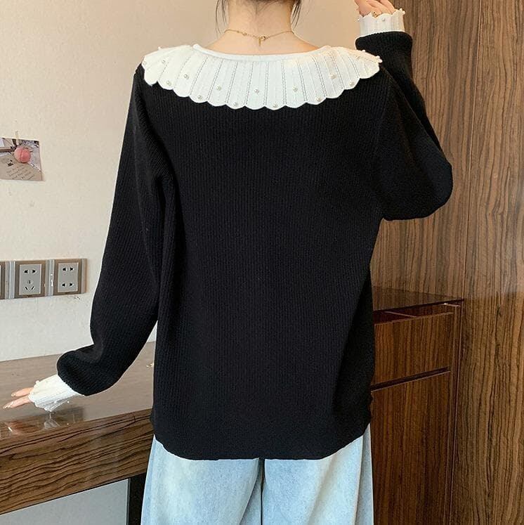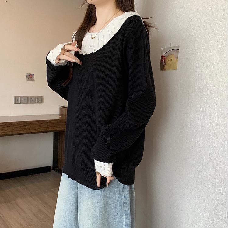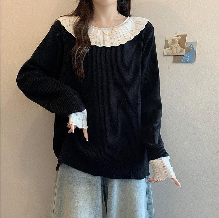 新品 大きいサイズ 秋冬 黒 パール襟 ニットセーター 可愛い 長袖 トップス