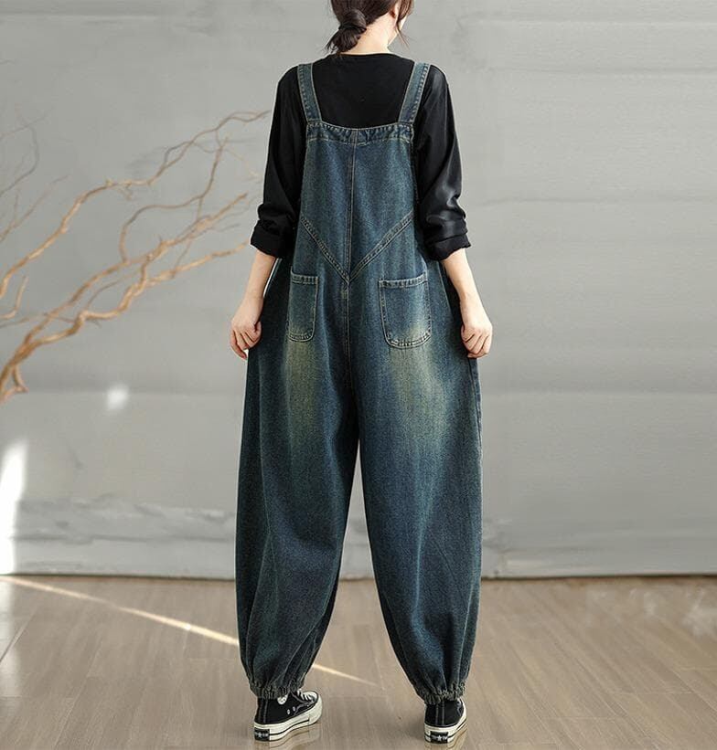 秋冬向けデニムサロペットです。ゆったりとしたルーズなシルエットと、裾のゴムが入ったバルーンパンツのようなデザインが特徴。胸元とサイドに大きめのポケットがあり、カジュアルで実用的なデザインです。ウォッシュ加工されたヴィンテージ感のあるデニム素材で、Tシャツやニットなどインナー次第で様々な着こなしが楽しめます。