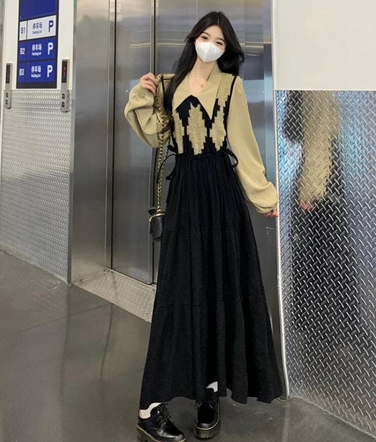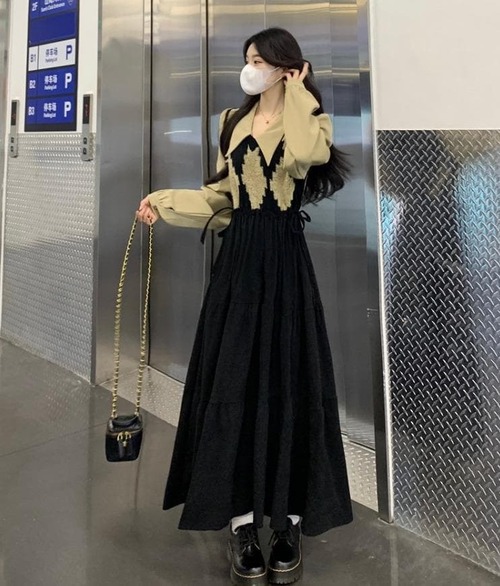 新品の秋冬向け、フェイクツーピースデザインのロングワンピースです。長袖のベージュカラーのブラウス(シャツ)と、黒のコーデュロイ素材のキャミソールワンピース(ベスト風)がドッキングされたデザイン。スクエアネックのベスト部分には個性的なジャガード織りのような柄があり、ウエストのドローストリングでシルエットを調整できます。一枚で韓国風のレイヤードスタイルが完成します。