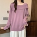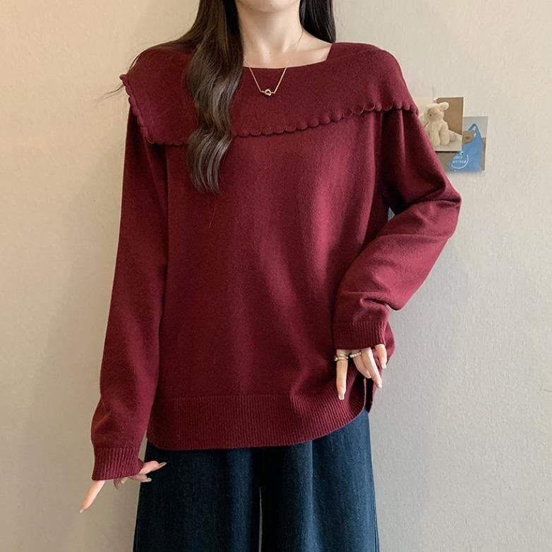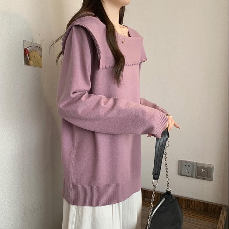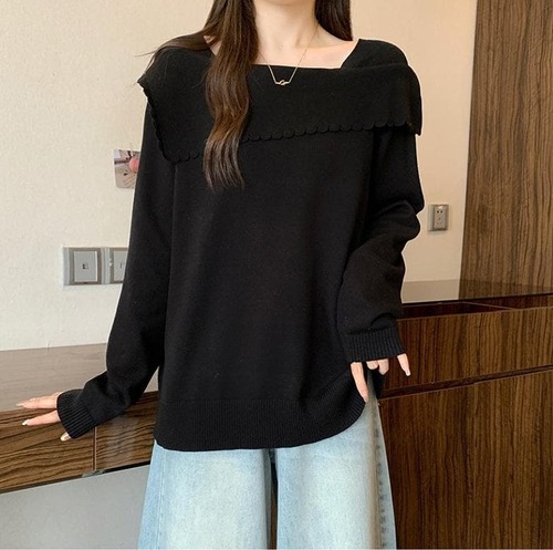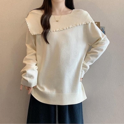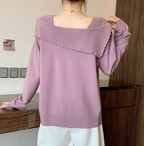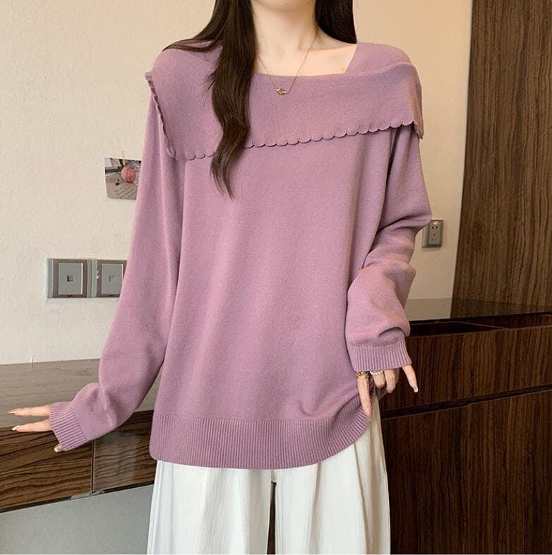 秋冬向け、韓国風デザインのニットトップスです。大きなスカラップ(波型)カットの襟が特徴的で、顔周りを華やかに見せてくれます。襟元はノッチドカラー(Vネック風)になっており、鎖骨が少し見えるデザインです。ゆったりとしたルーズなシルエットで楽な着心地。シンプルなデザインながらも、襟の可愛らしさが際立ちます。カラーは、画像にあるアイボリー、パープル、ブラック、ワインレッドなどがあります。