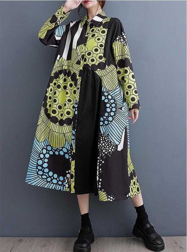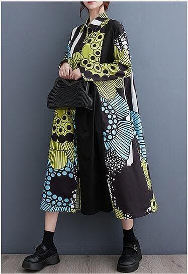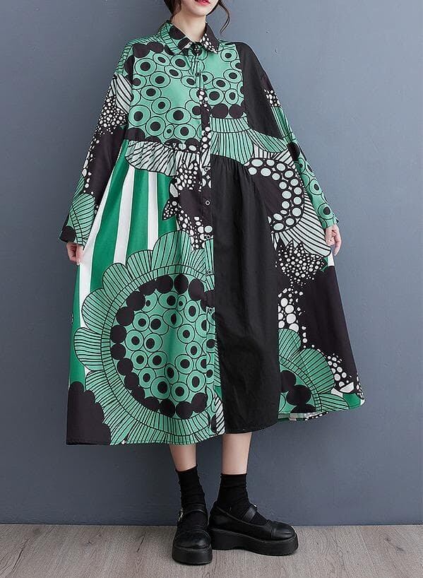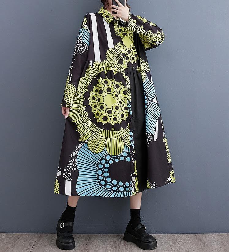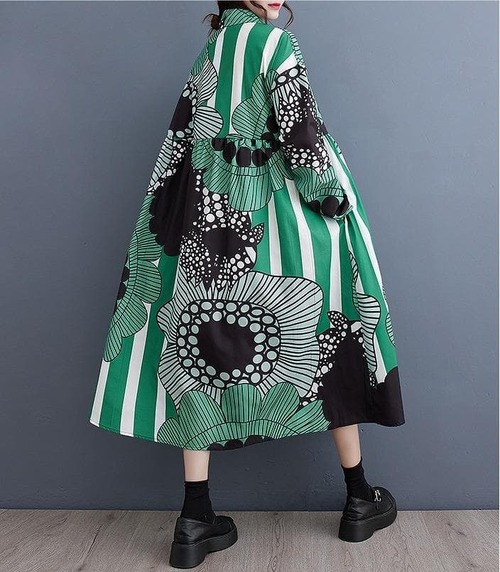 韓国風ルーズフィットロングワンピースです。大胆なボタニカル柄やストライプ柄を組み合わせたパッチワークデザインが特徴で、非常に個性的でアーティスティックな雰囲気です。シャツワンピースタイプで、襟付き、ボタンで前開きになっています。ゆったりとしたオーバーサイズのAラインシルエットで、体型を気にせずリラックスして着用できます。