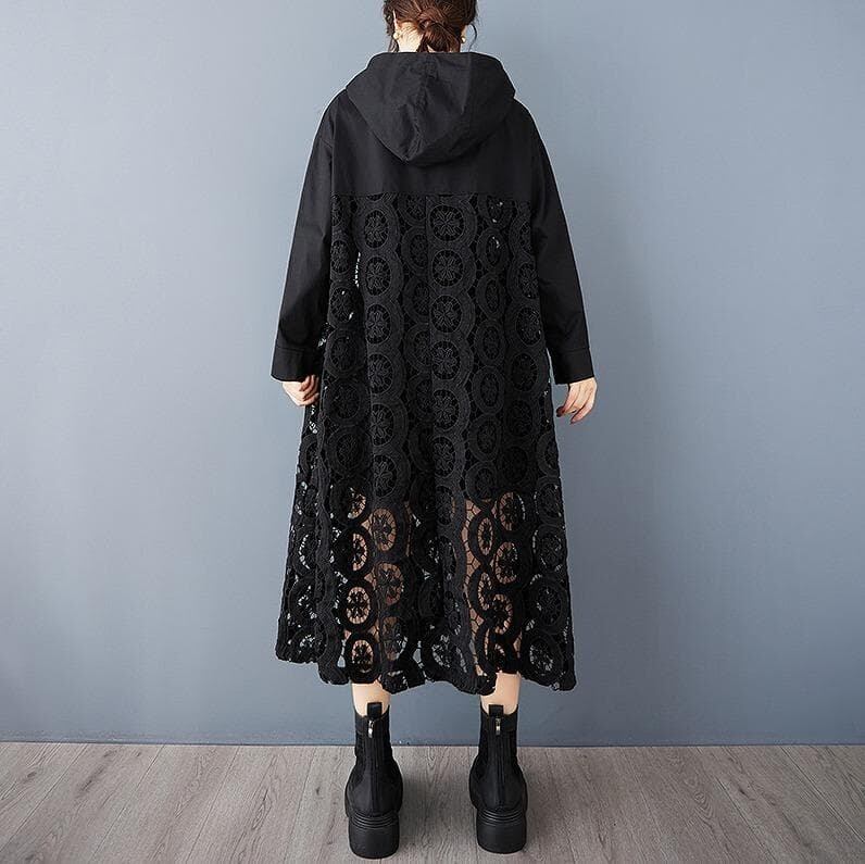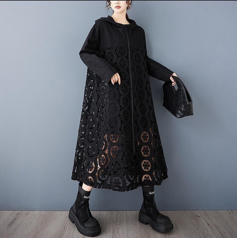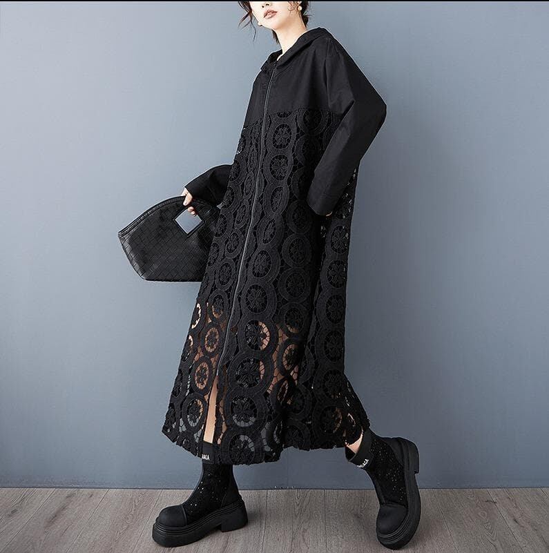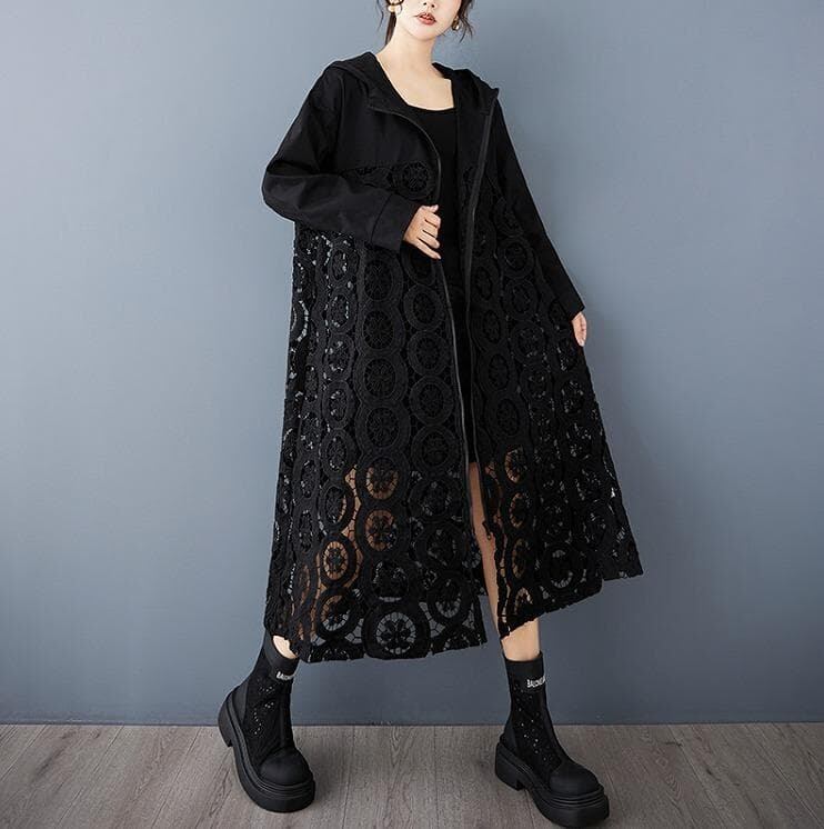 ダークカラー(ブラック)のフード付きコートです。全体的に透かし彫りのようなユニークな織り柄(レースパッチワーク、メッシュ素材など)と、フリルのようなレースの縁取りが施された個性的なデザインが特徴です。フロントはジッパー開閉で、ゆったりとしたルーズなシルエットです。軽やかな素材感で、春や秋の変わり目にぴったりの羽織り(アウター)として活躍します。