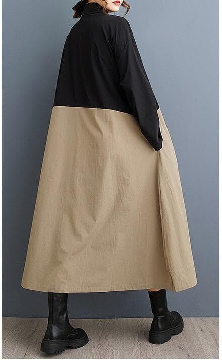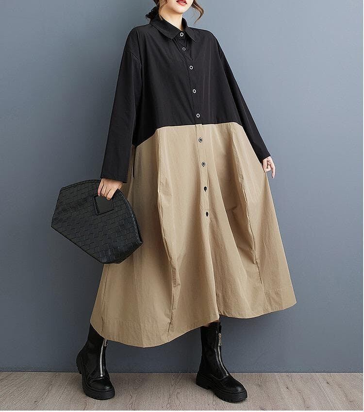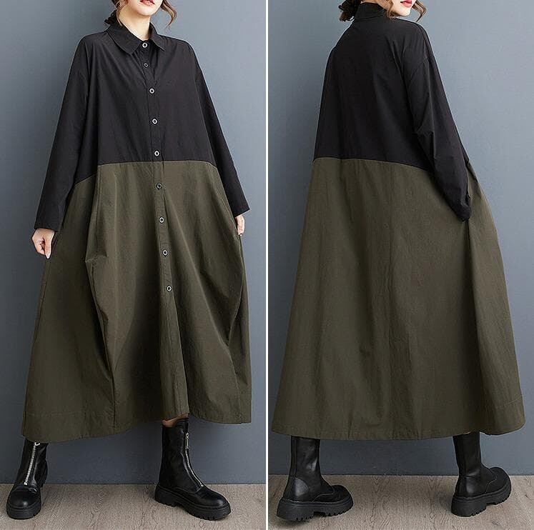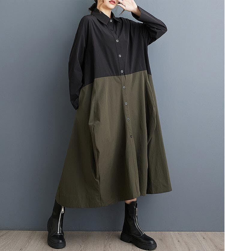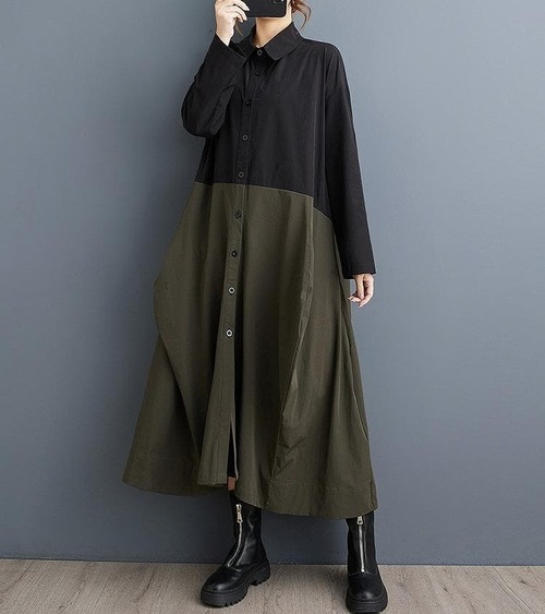 #新品 #大きいサイズ #シャツワンピース #ロングワンピース #カラーブロック #カーキ #アーミーグリーン #アシンメトリー #韓国ファッション #春秋コーデ #体型カバー
