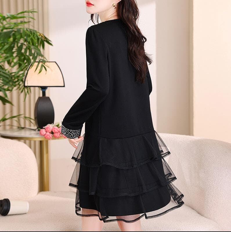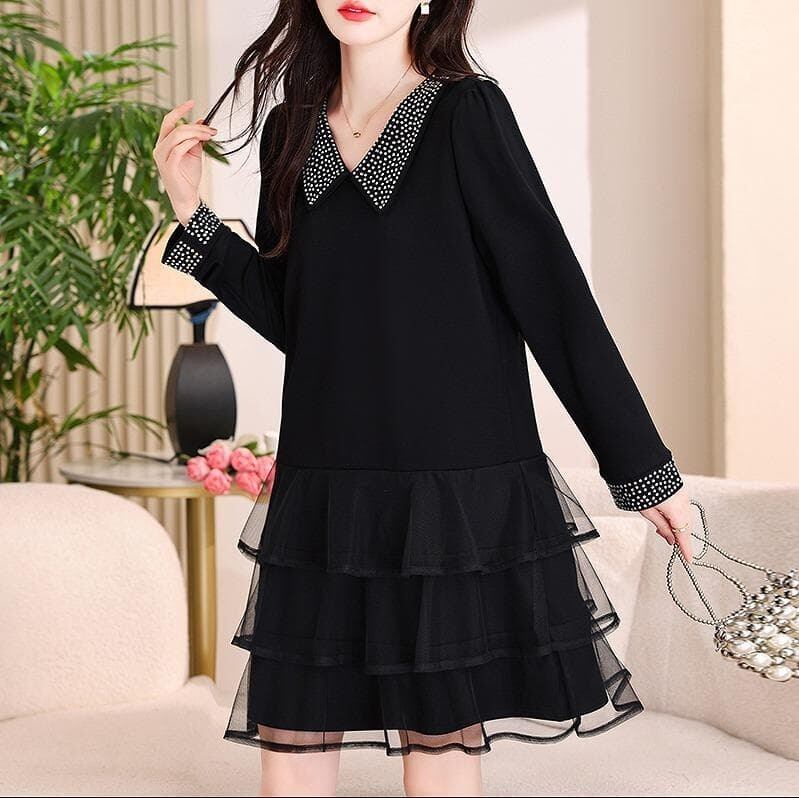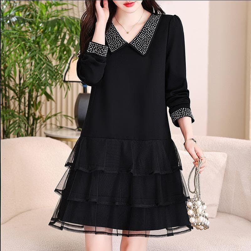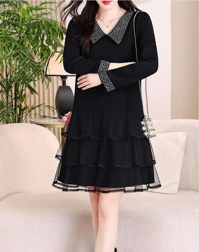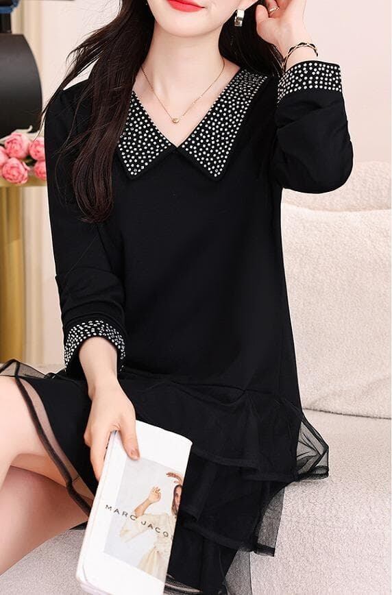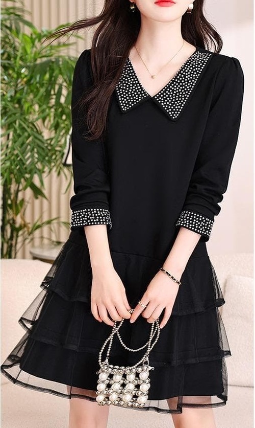 #新品 #大きいサイズ #ブラックドレス #リトルブラックドレス #ラインストーン #ビジュー襟 #メッシュ切替 #春新作 #ぽっちゃりコーデ #痩せ見え #シフォンワンピース