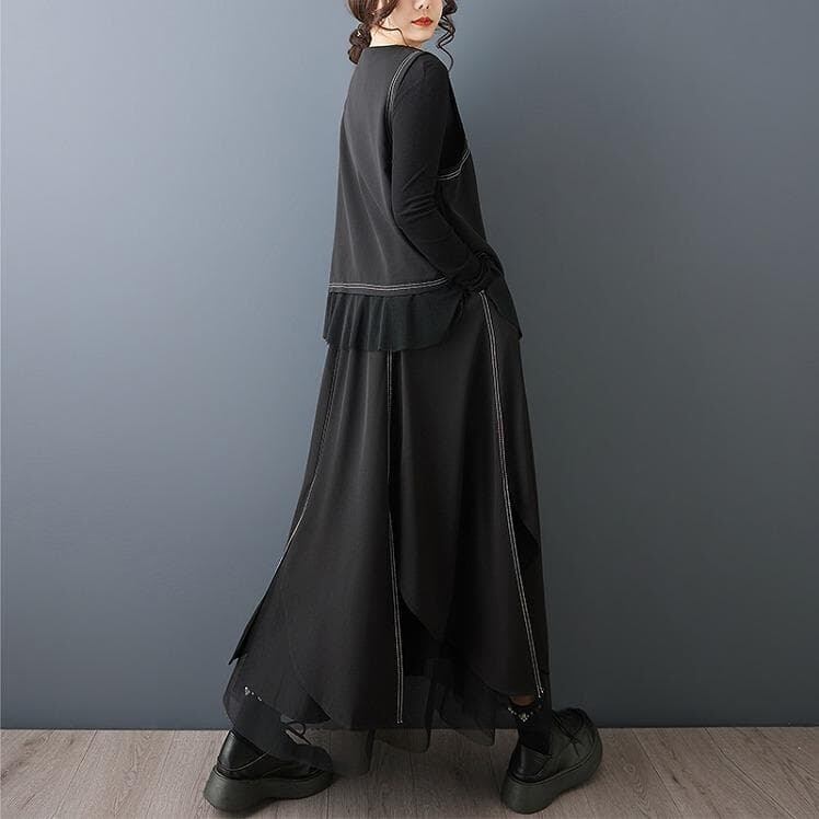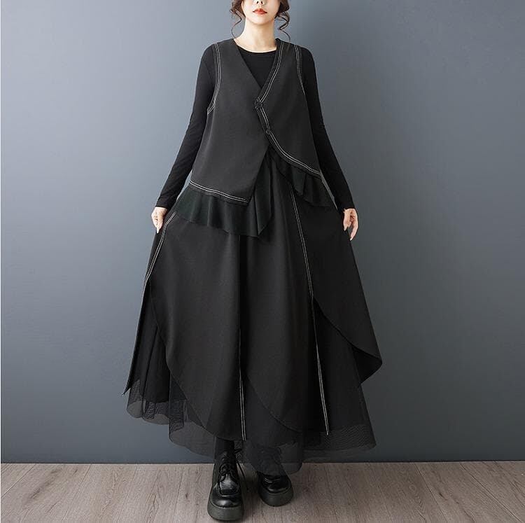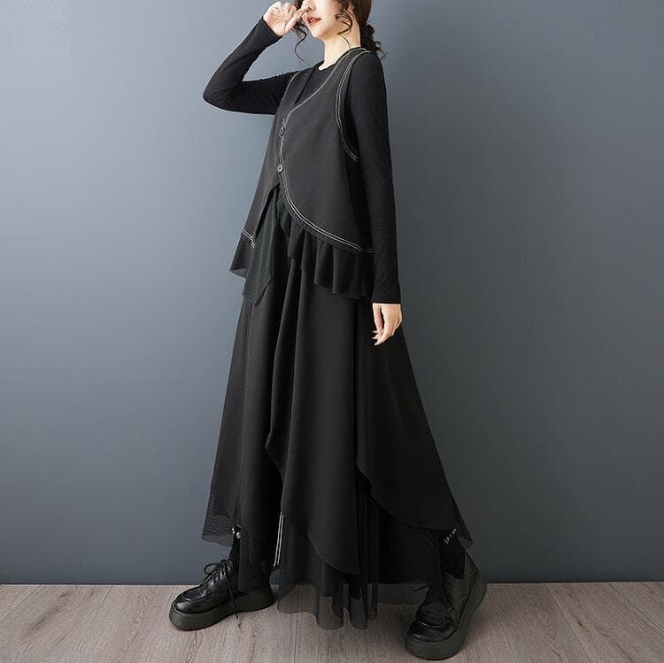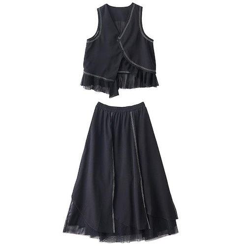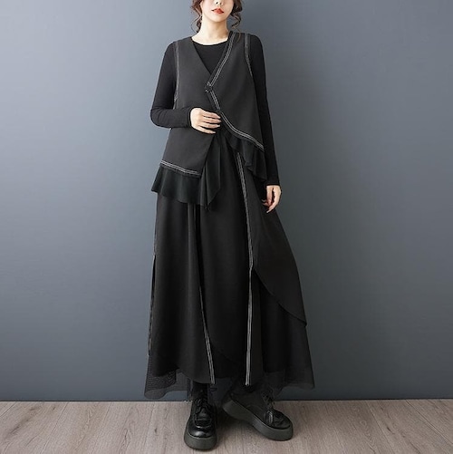#新品 #セットアップ #ツーピース #ベストコーデ #ロングスカート #メッシュスカート #レトロファッション #ヴィンテージライク #モード系 #黒コーデ #トップステッチ #個性派ファッション #体型カバー #大人カジュアル #通勤コーデ #デート服