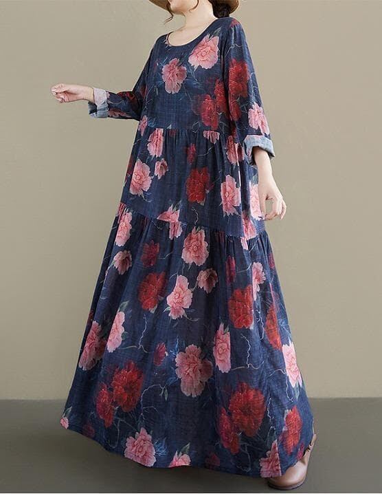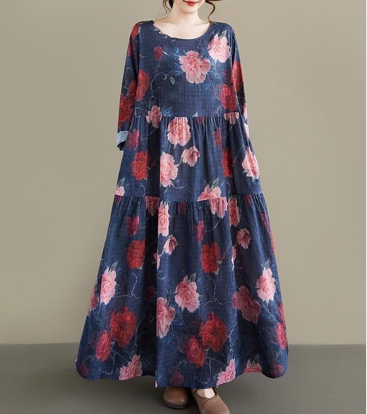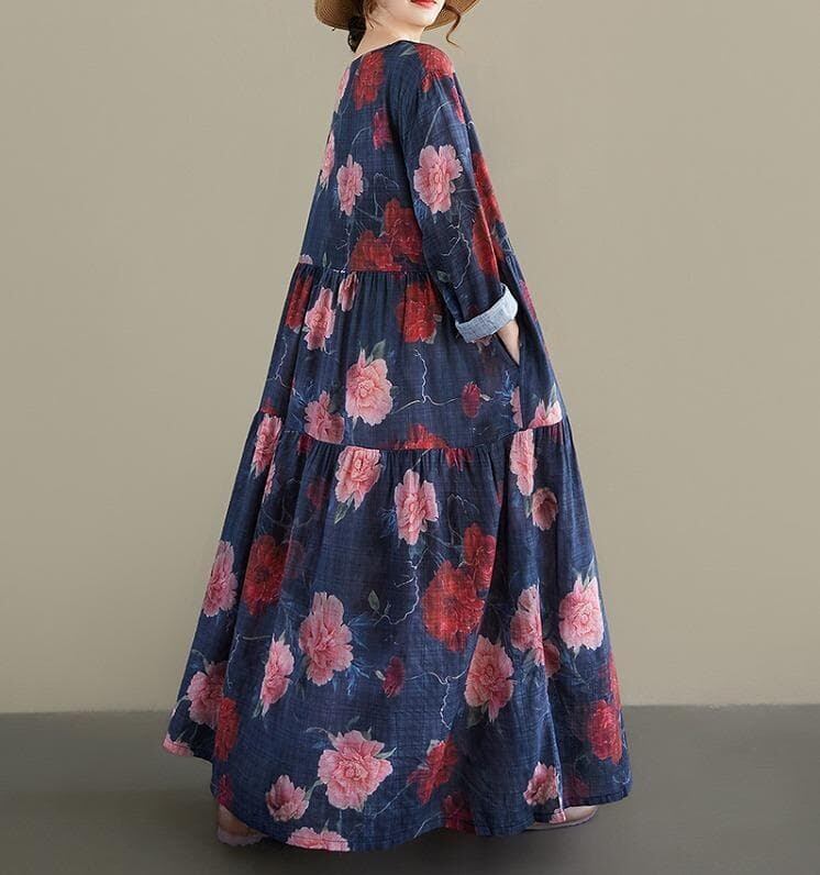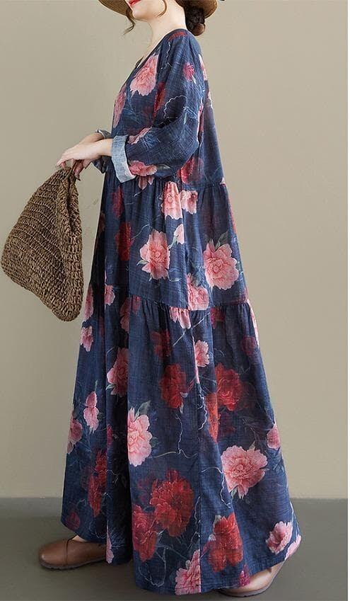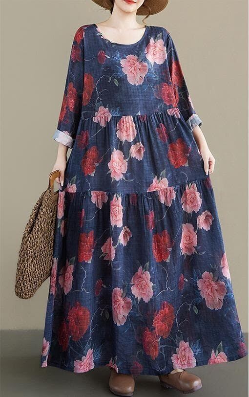シックなネイビーに大ぶりの花柄が映える、春の新作ロングワンピースです。ナチュラルな風合いで、ゆったりとしたAラインシルエットが体のラインを綺麗にカバーしてくれます。
