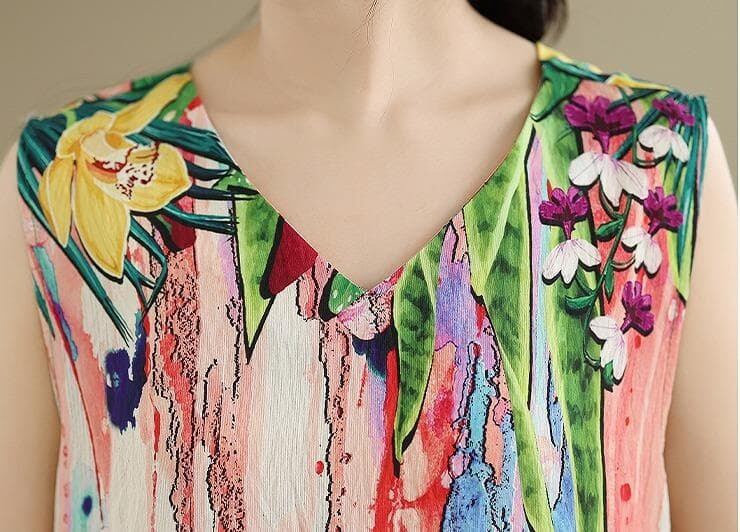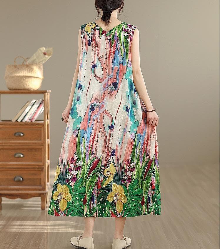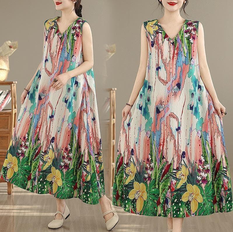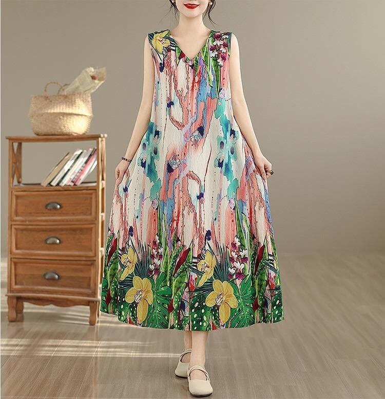 鮮やかなボタニカルプリントが夏の日差しに映える、ノースリーブロングワンピースです。さらりと涼しい肌触りが魅力。深めのVネックが顔周りをすっきりと見せ、ゆったりとしたAラインシルエットが体型を美しくカバーします。
