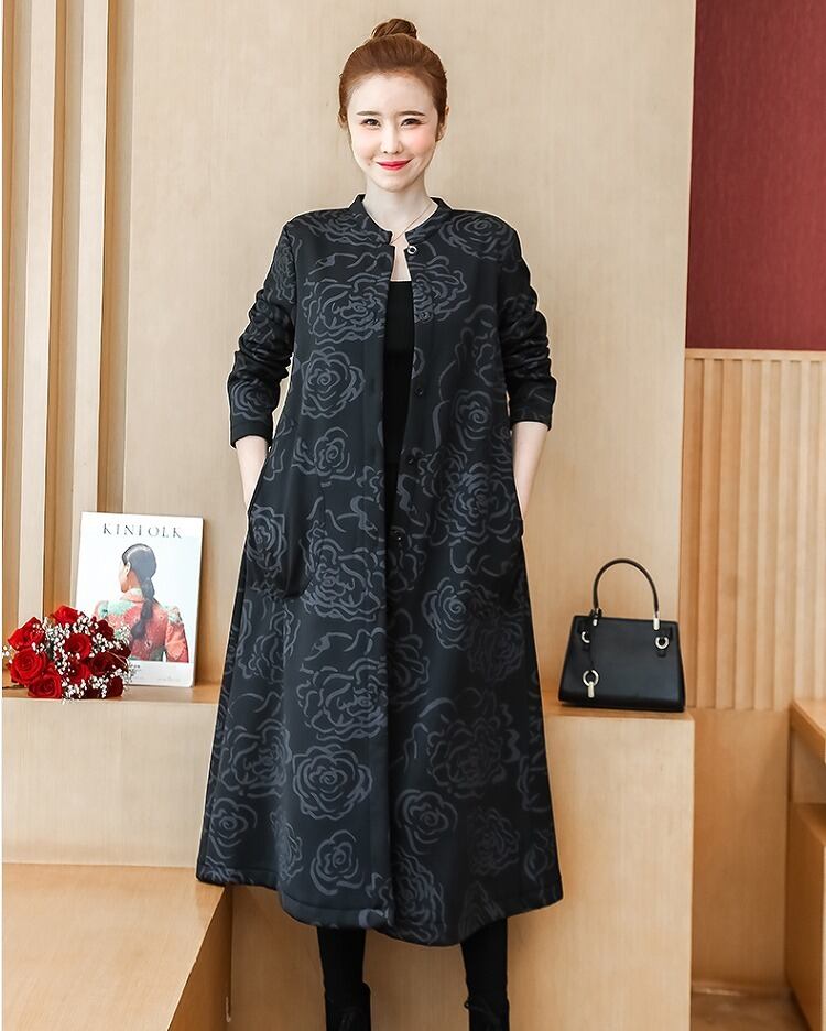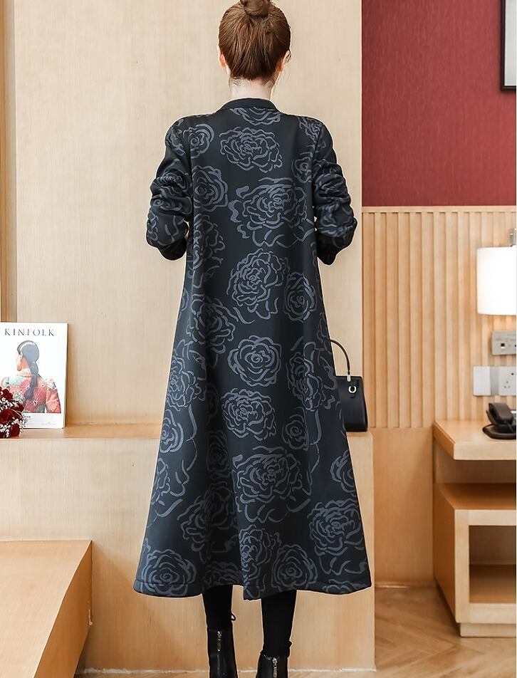 大きいサイズ レディース 花柄ノーカラーロングコート モノトーン 長袖 秋冬 アウター