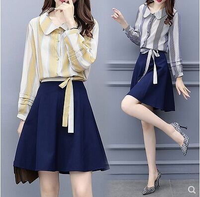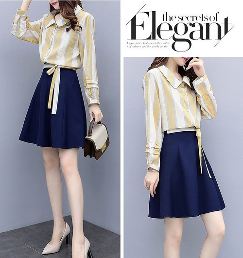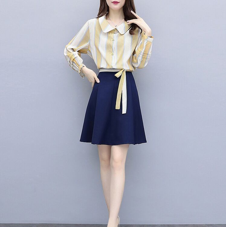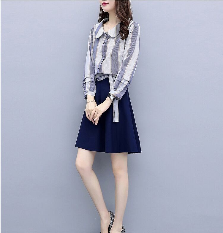 大きいサイズ レディース ストライプシャツ&スカート 上下セット セットアップ 秋冬 長袖 チェック