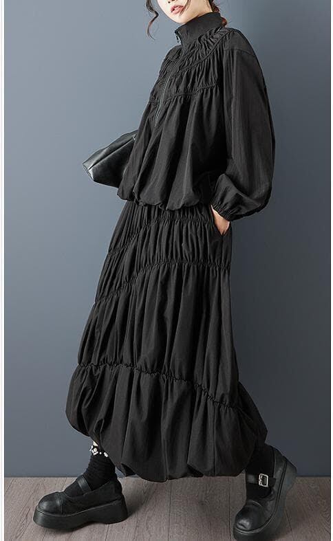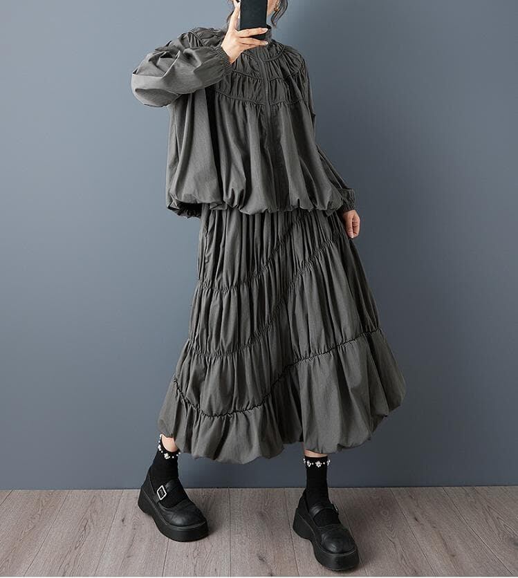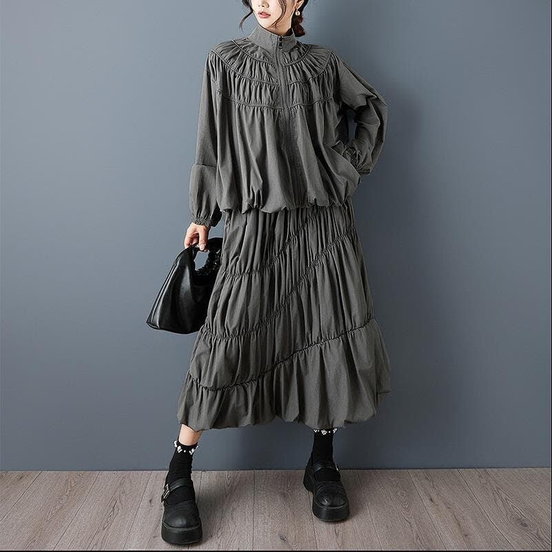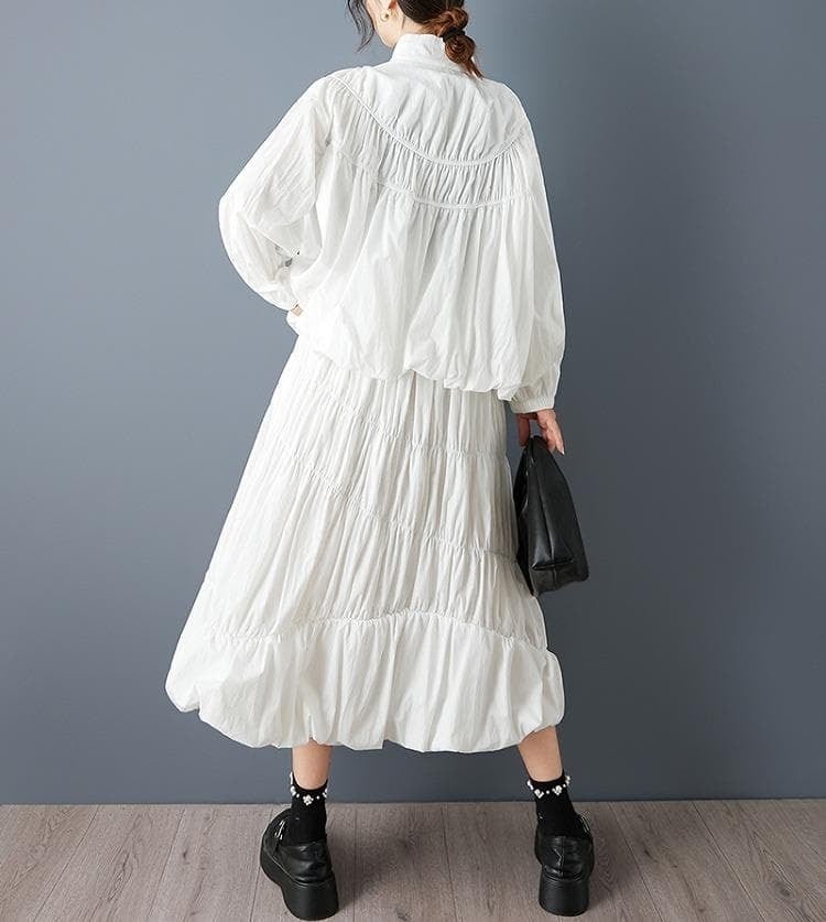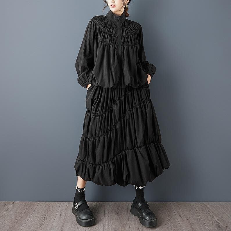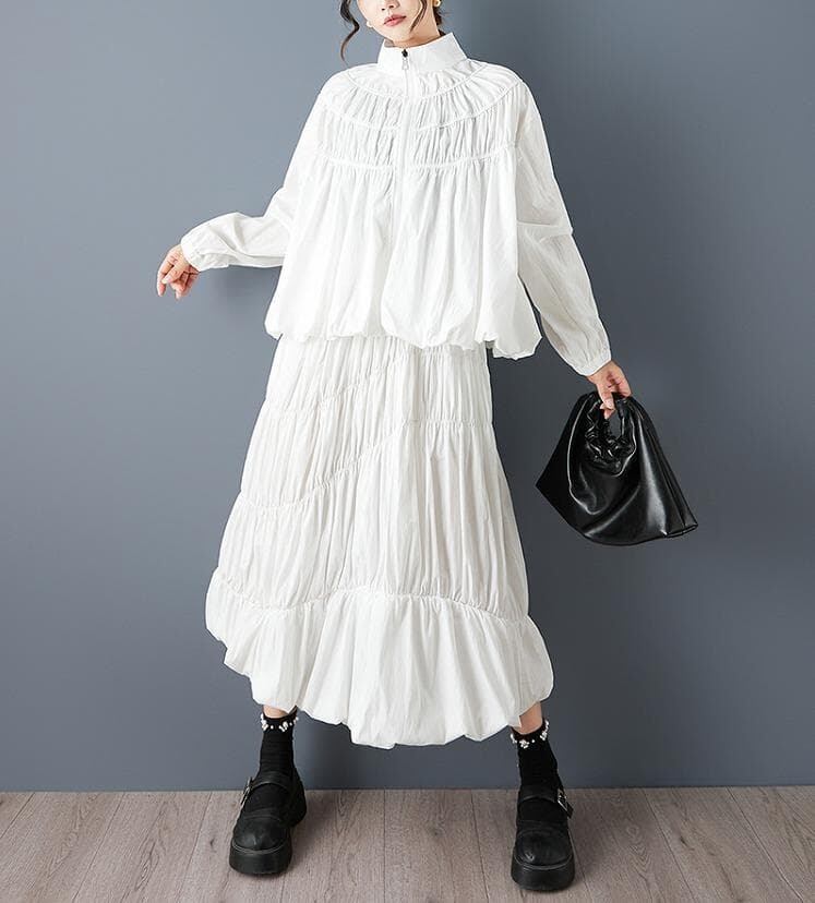 スタンドカラーのジップアップシャツと、ボリューム感のあるティアードスカートを組み合わせた、ハイセンスな2点セットです。