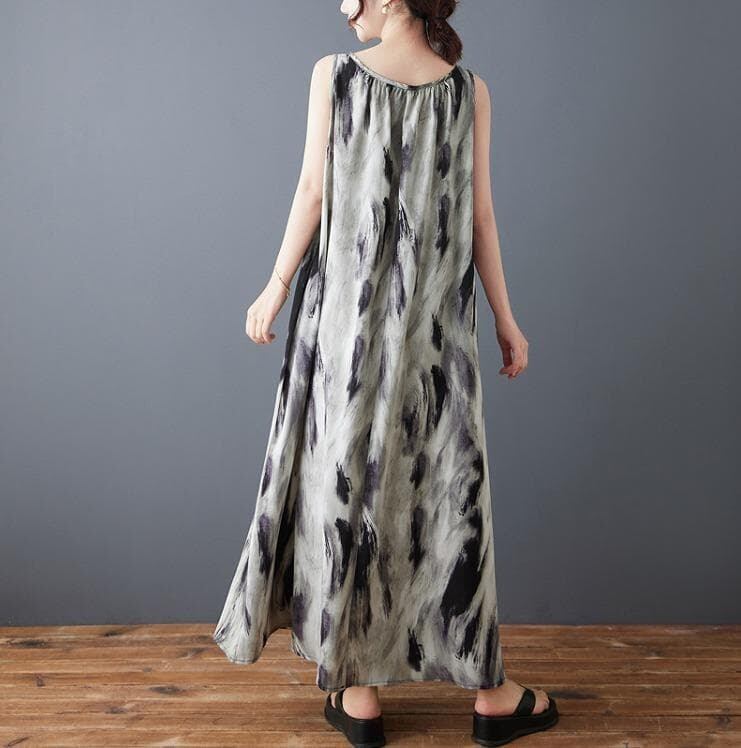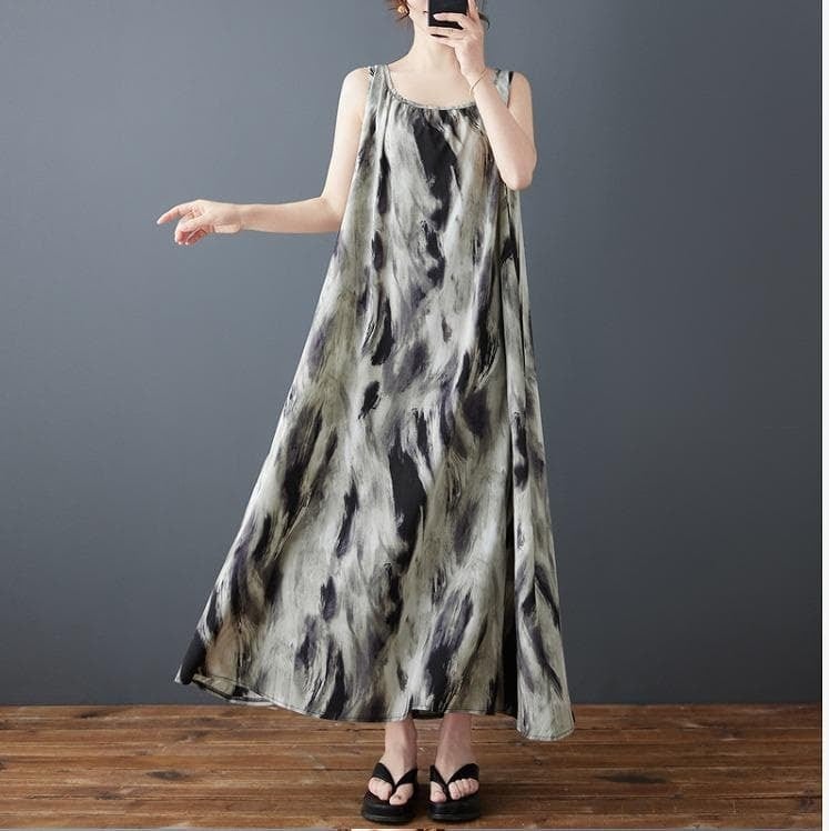 【新品】大きいサイズ春夏ノースリーブ ボヘミアン プリント シフォンワンピース スタンドカラーノースリーブミディ丈ルーズ