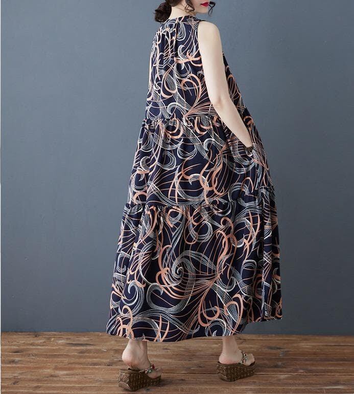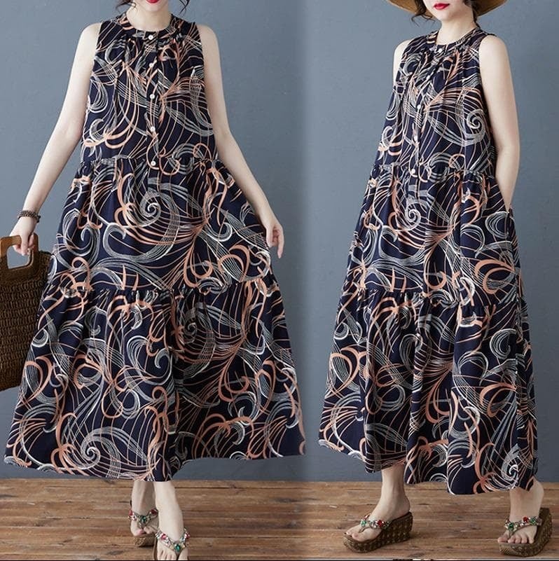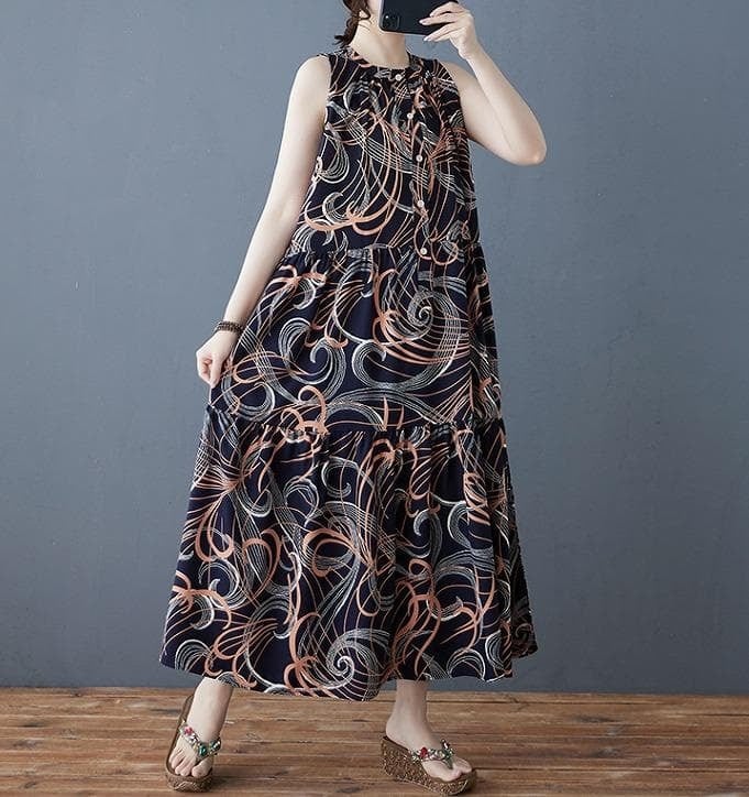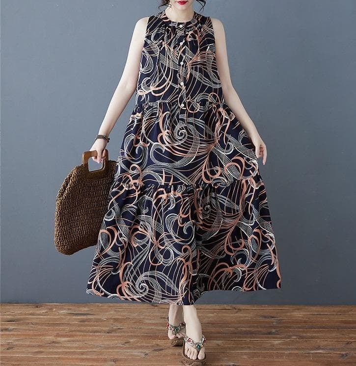 【新品】大きいサイズ夏服ボヘミアンプリントシフォンワンピース スタンドカラーノースリーブミディ丈ルーズ