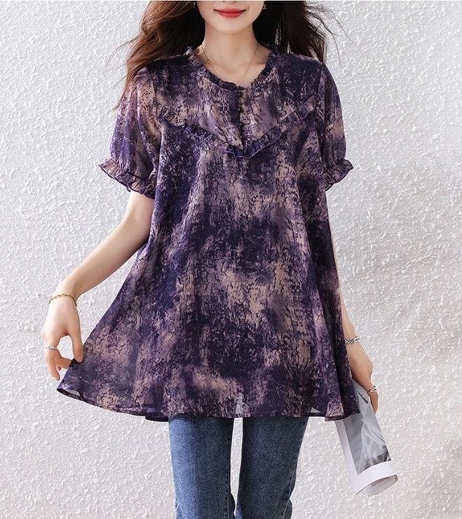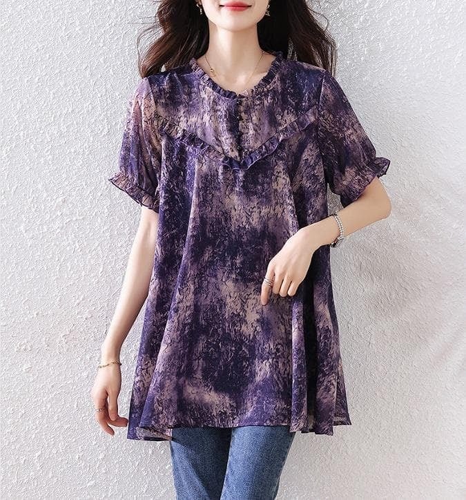 【新品】大きいサイズ夏服ゆったり半袖 花柄シフォンブラウス