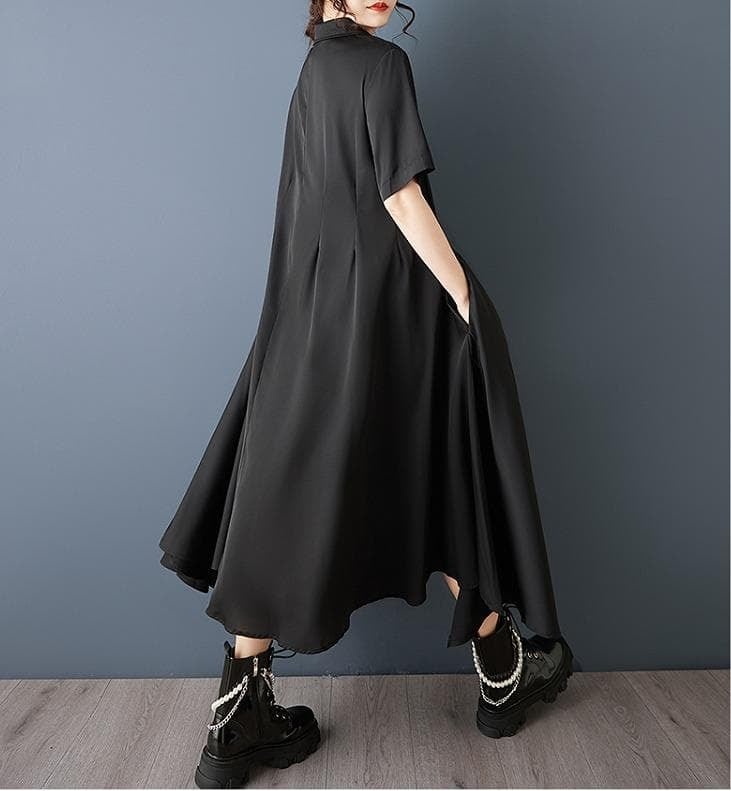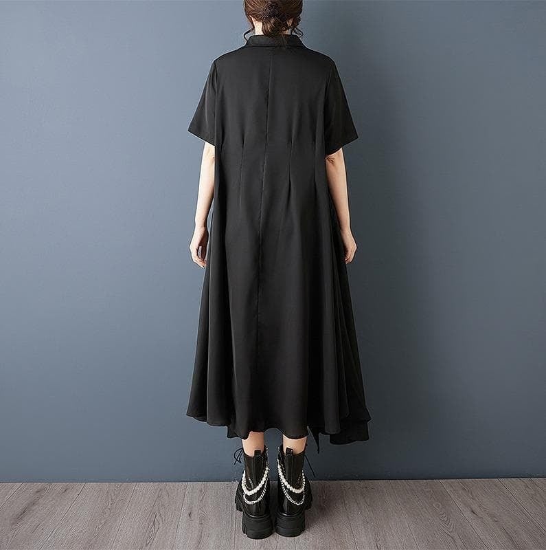 【新品】大きいサイズ春夏半袖アシメ ワンピース 黒 ゆったり ラージ体型カバー着痩せ細見え