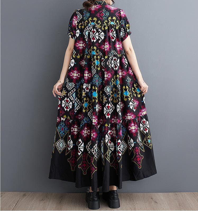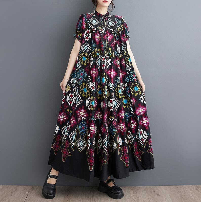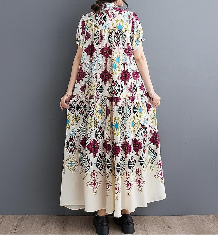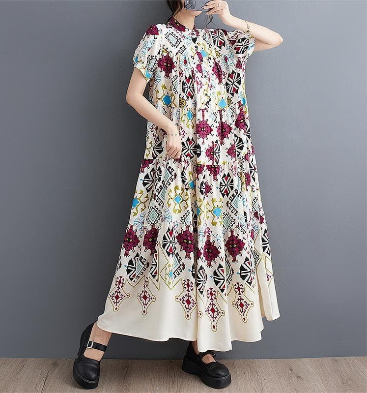 韓国風夏新作 大きめサイズ ルーズ着やせ おしゃれ半袖プリントミディワンピース