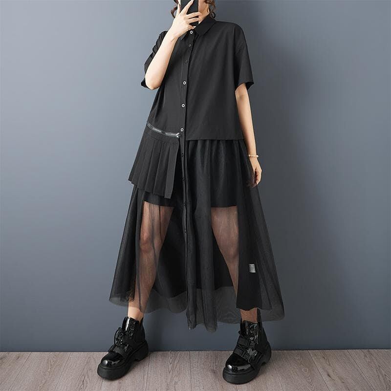 ブラックベースに透け感のあるチュール素材を組み合わせた、個性と上品さを兼ね備えた1枚。