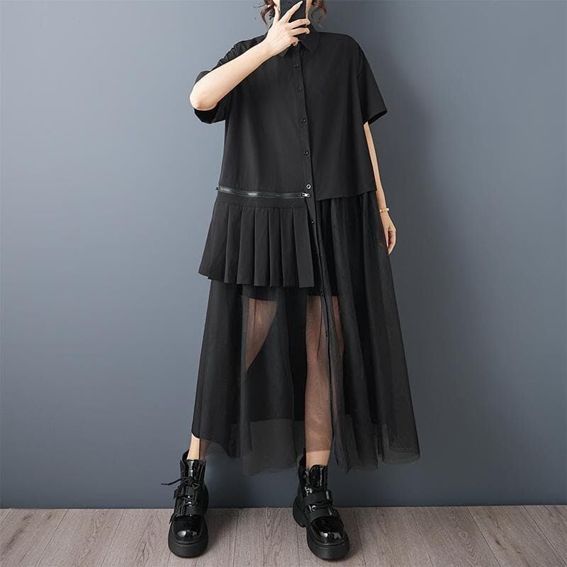 大きいサイズ 新品 黒ワンピース シアー切替 ロング 半袖 体型カバー ゆったり モード