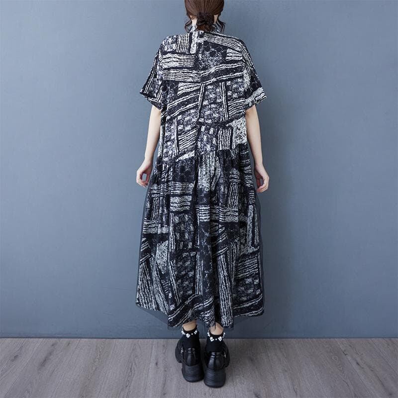大きいサイズ 新品 黒ワンピース 総柄 半袖 ロング ゆったり 体型カバー モード
