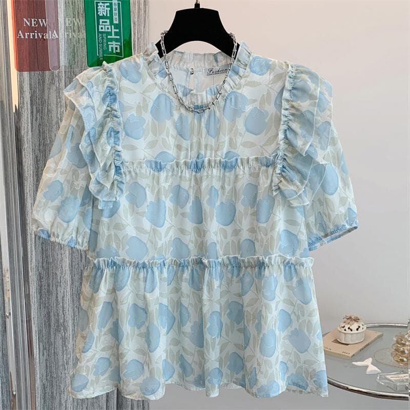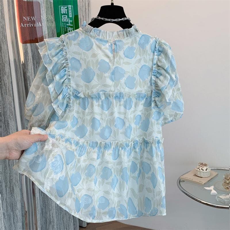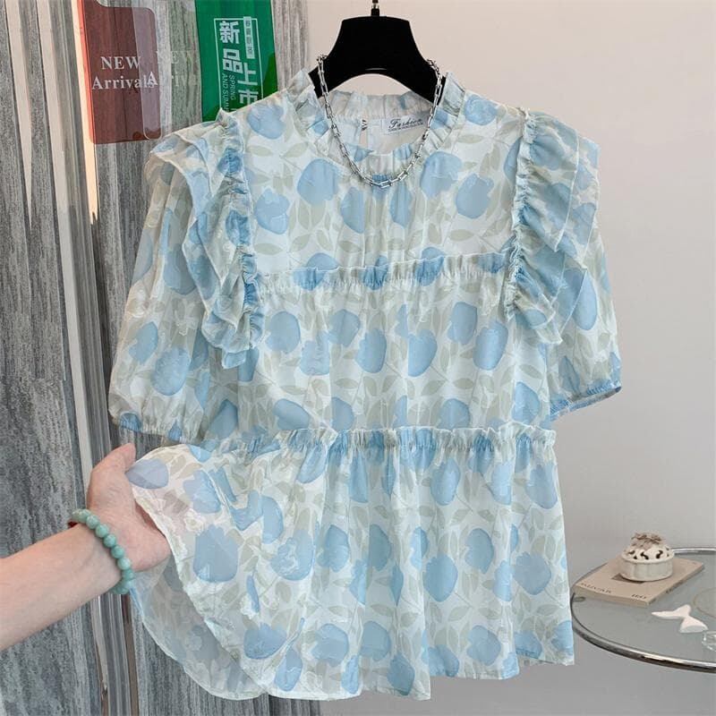 大きいサイズ 新品 レディース ブラウス 半袖 花柄 シフォン フリル ゆったり 体型カバー トップス 夏 涼しい おしゃれ