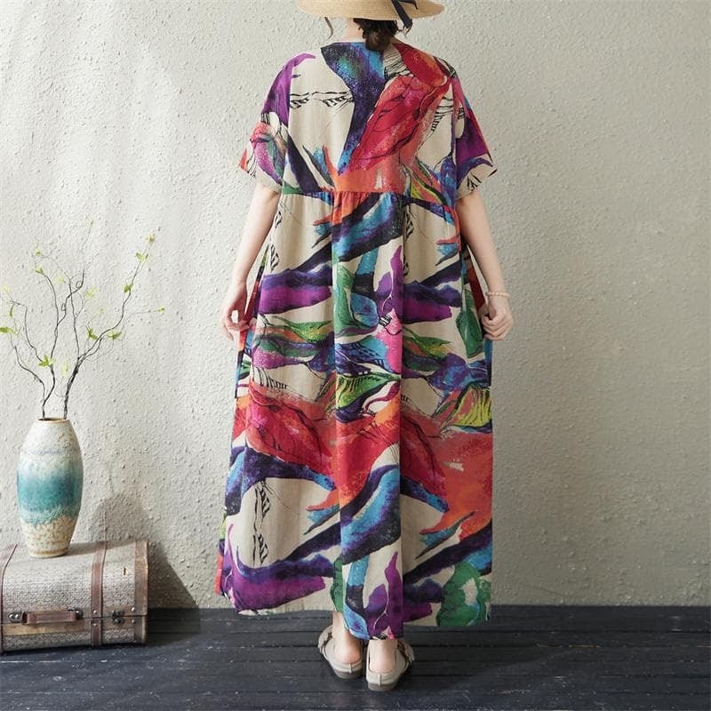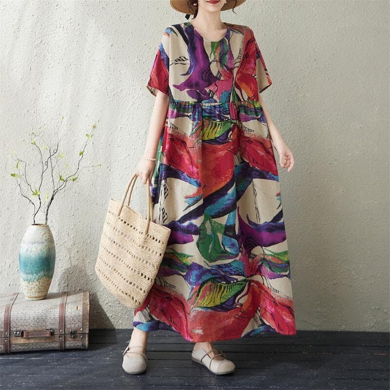 新品 大きいサイズ 花柄ロングワンピース 半袖 ゆったり 体型カバー 夏 文芸風