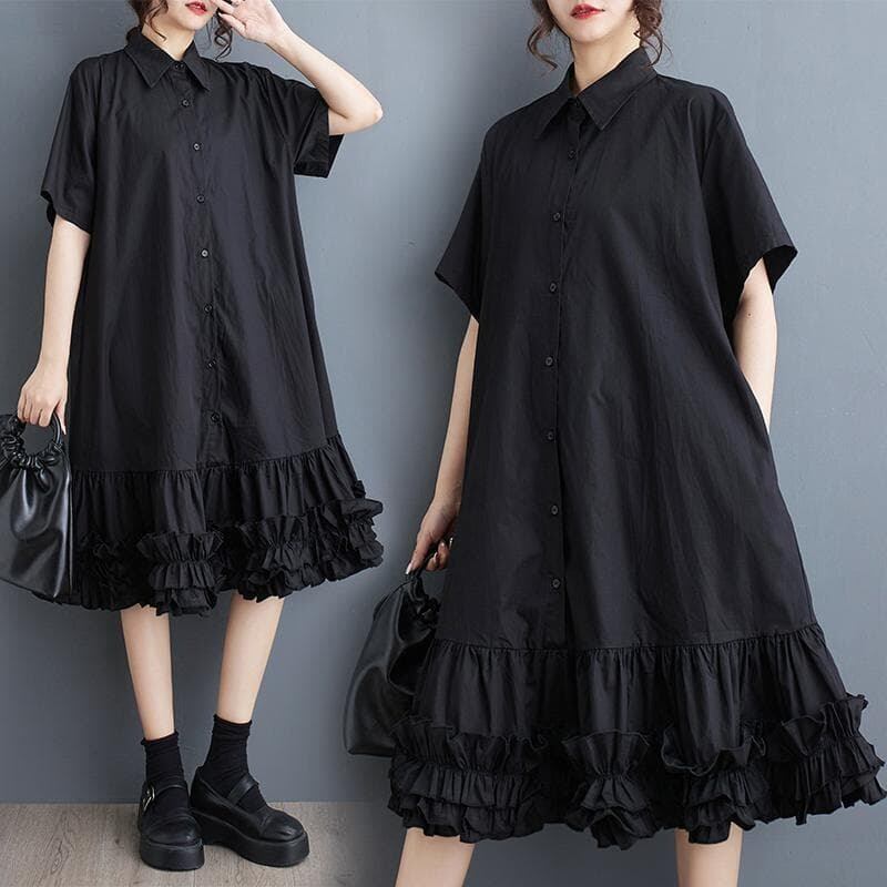 新品 大きいサイズ 黒フリルシャツワンピース 半袖 ゆったり 体型カバー 夏