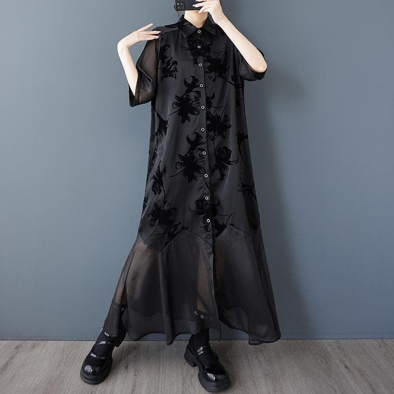 新品 大きいサイズ 春夏 半袖 シアーシャツワンピース 黒 ゆったり 体型カバー レディース モード系