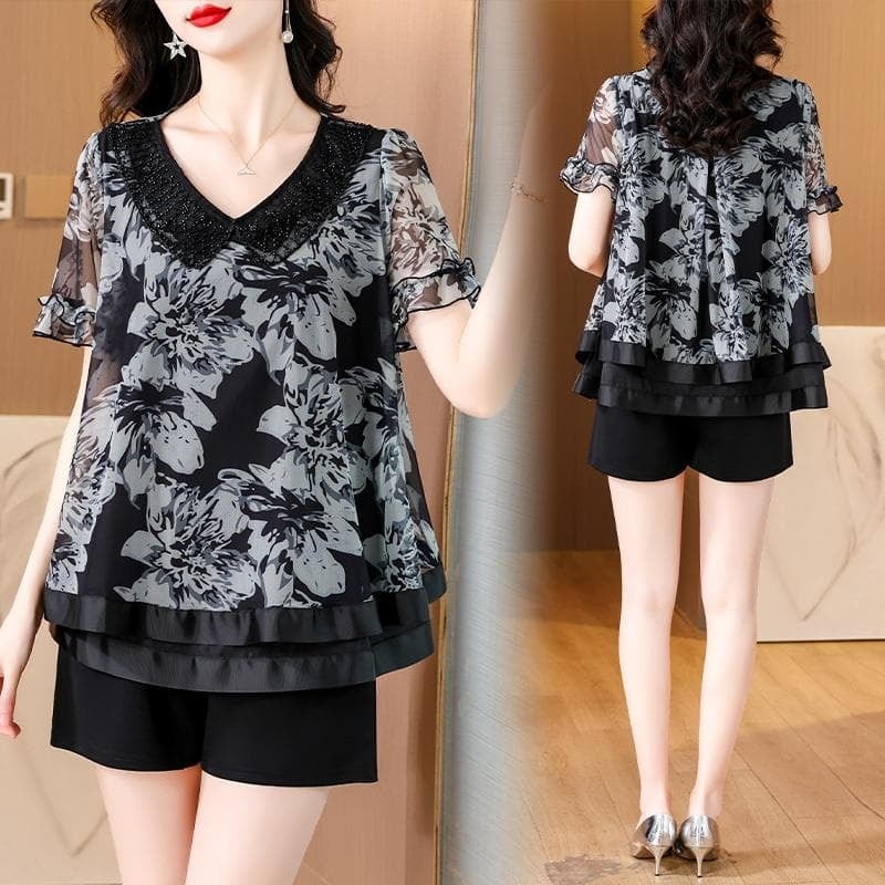 新品 大きいサイズ 春夏 半袖 花柄セットアップ シアートップス ショートパンツ 体型カバー レディース