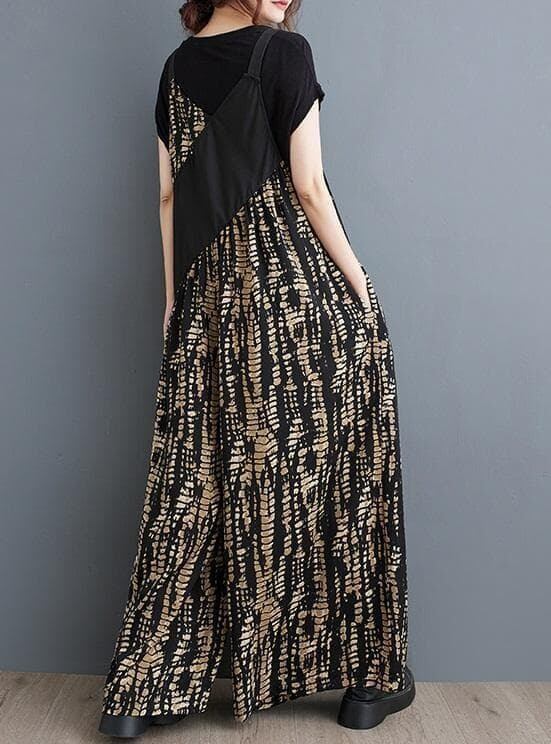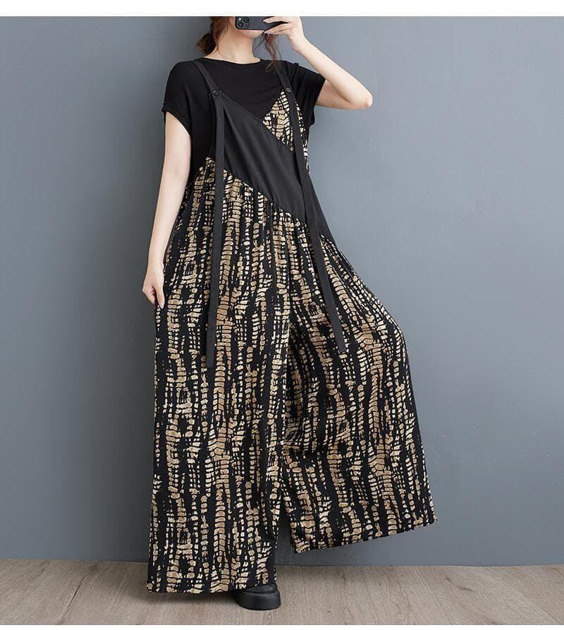 存在感のある柄デザインが目を引くサロペットパンツ。
