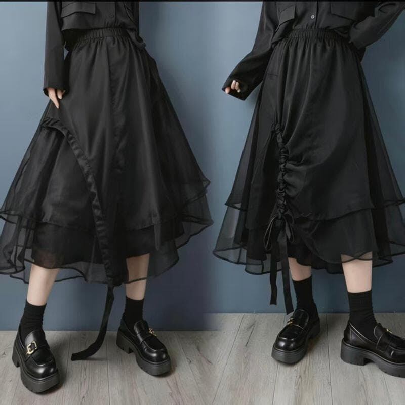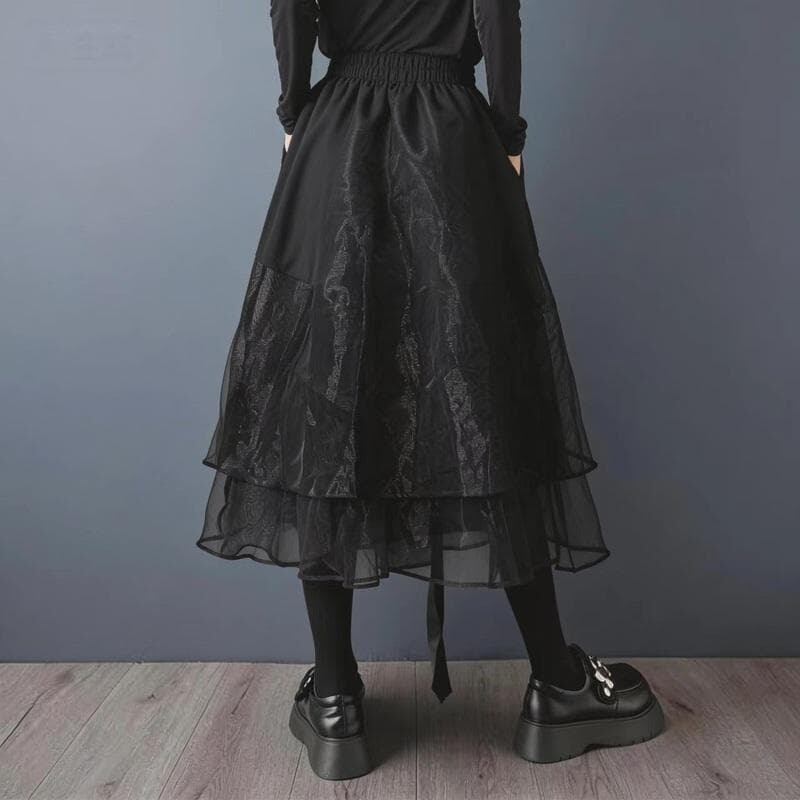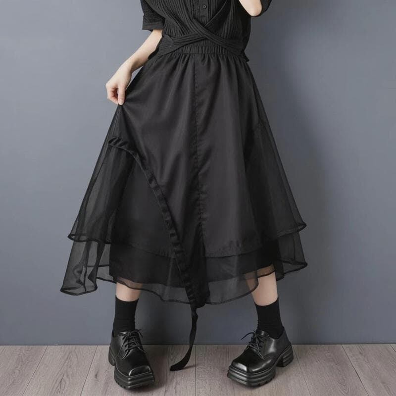新品大きいサイズ春夏ロングスカート黒チュールフレア体型カバーゆったりオーバーサイズ着痩せモードドロスト不規則デザイン韓国風人気トレンドレディース