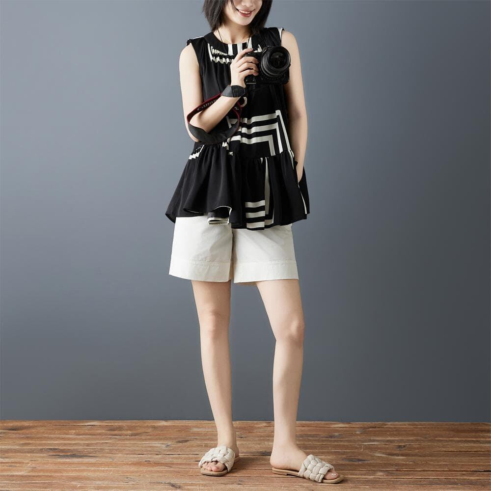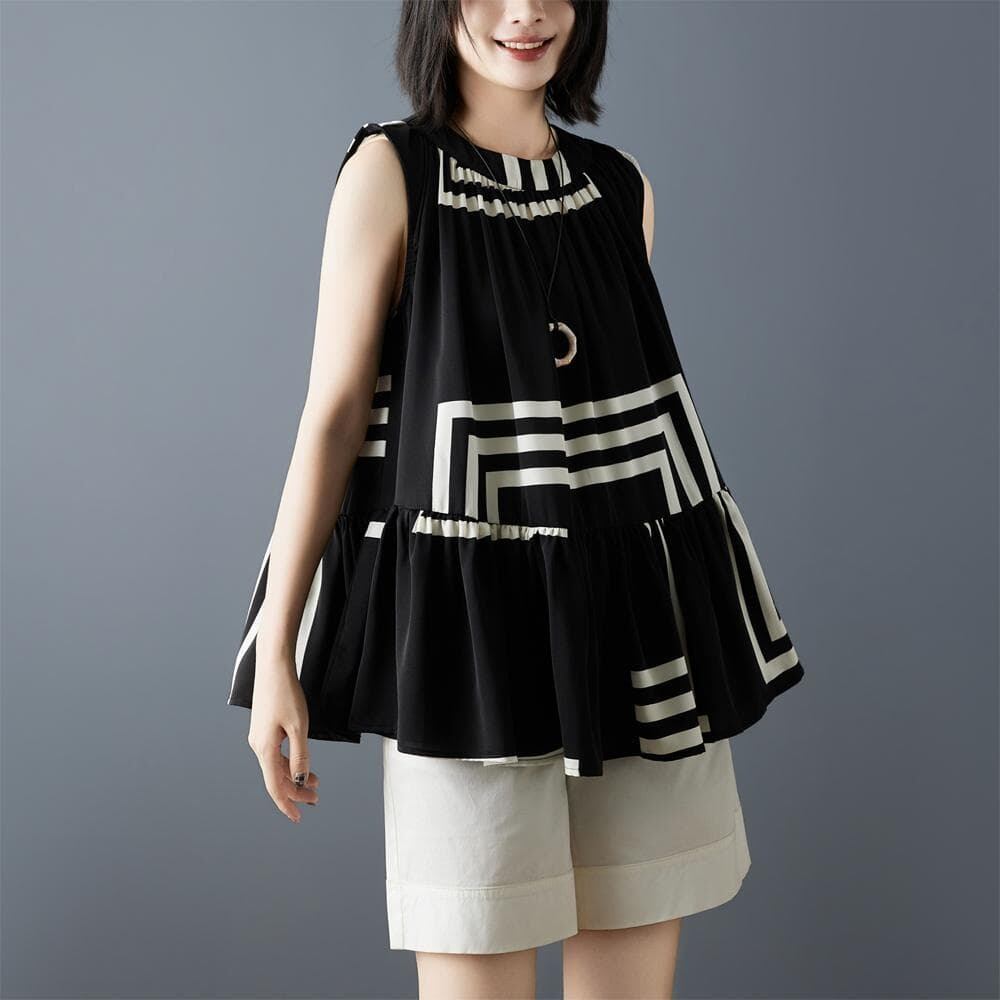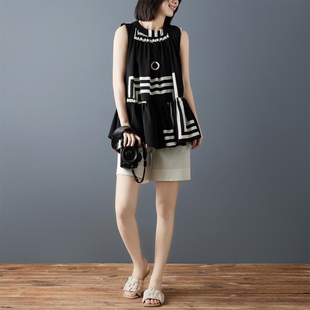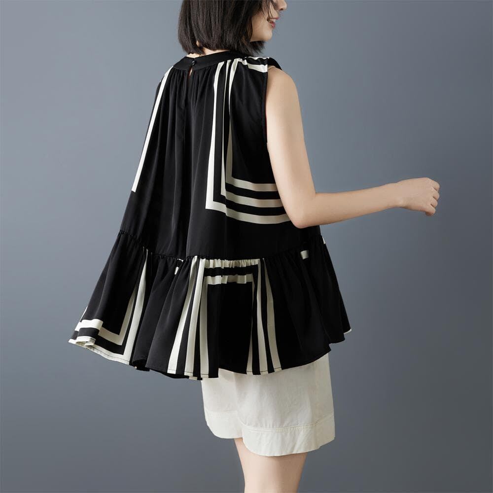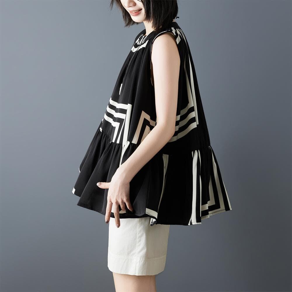 新品大きいサイズ春夏ノースリーブブラウスシフォン不規則ストライプ印花ゆったり体型カバーオーバーサイズ着痩せ薄手韓国風人気