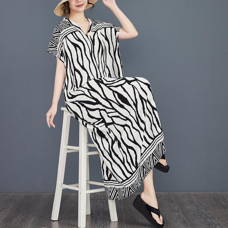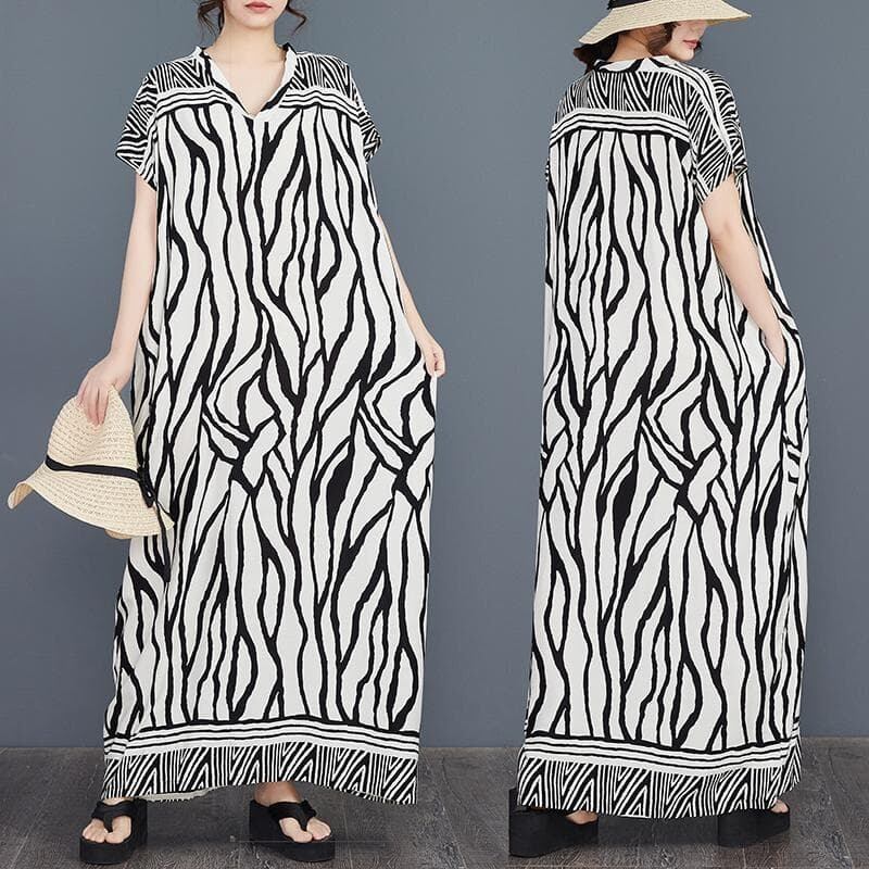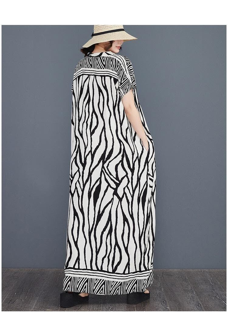 大きいサイズ 新品 夏 ゼブラ柄ロングワンピ 半袖 Vネック ゆったり 体型カバー フリーサイズ 2L 3L 4L 5L