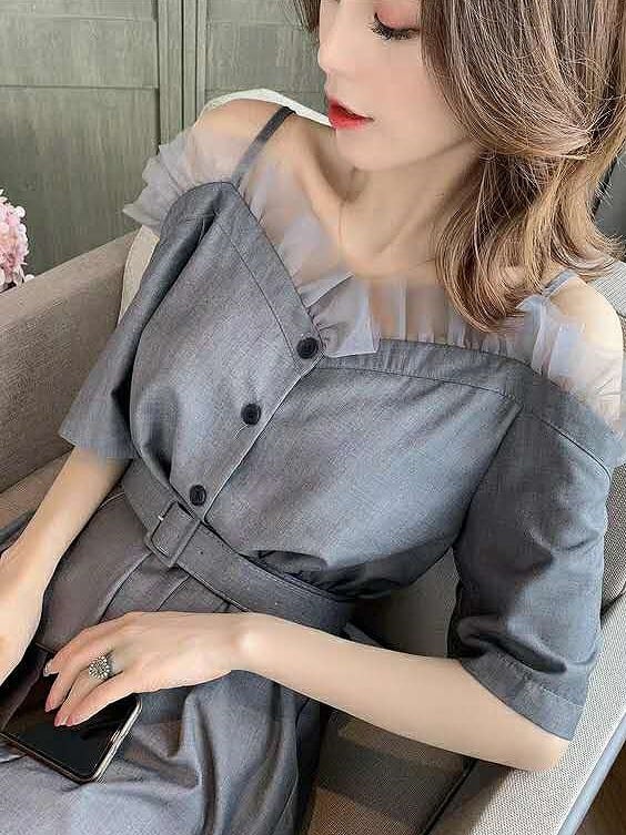 大きいサイズ レディース ベルト付きオフショルダーワンピース 半袖 五分袖 春夏 肩出し