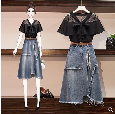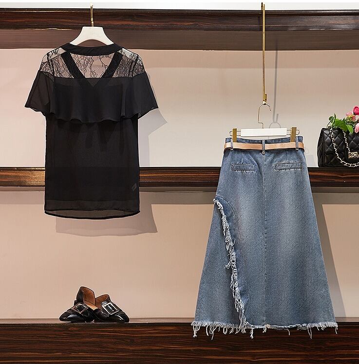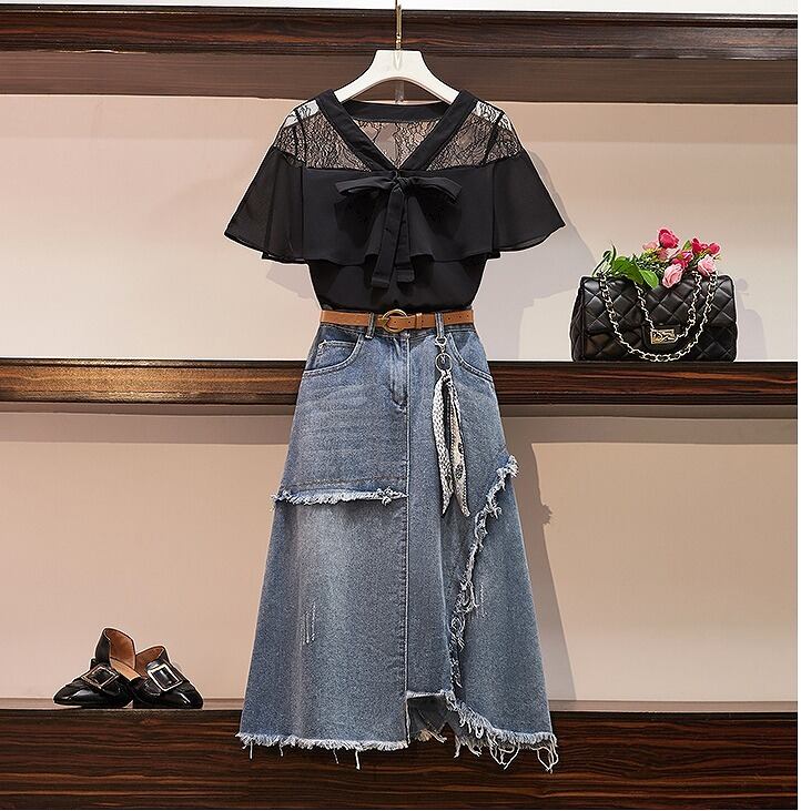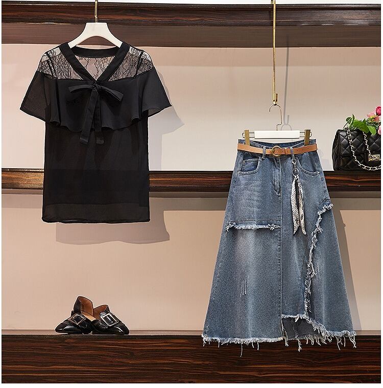 大きいサイズ レディース トップス&デニムスカート セットアップ ダメージ フェミショル 上下セット 半袖 春夏