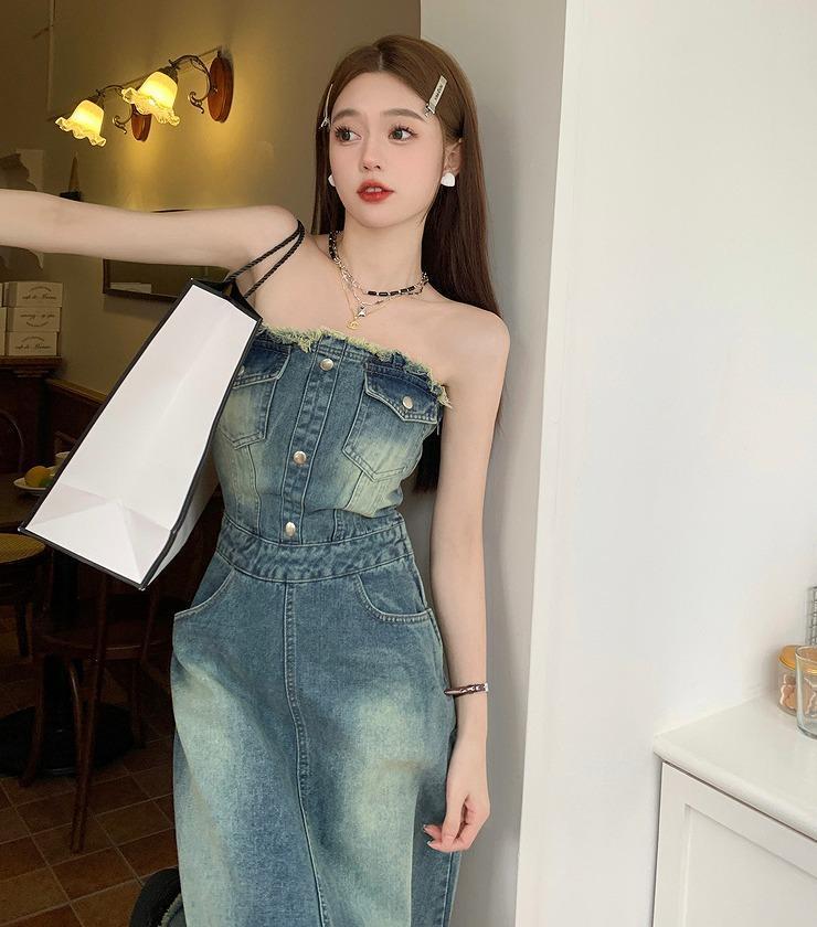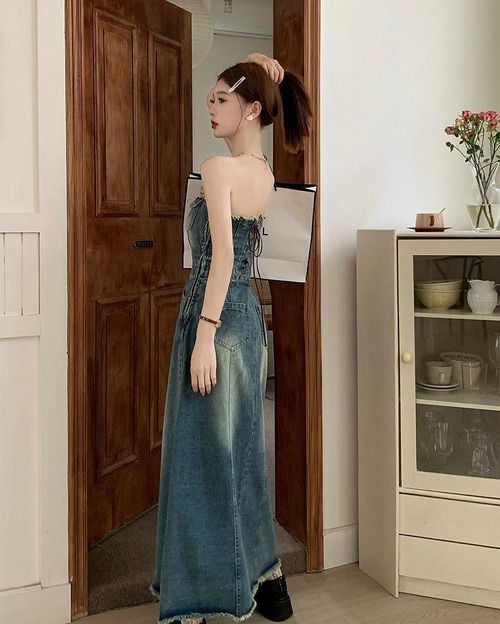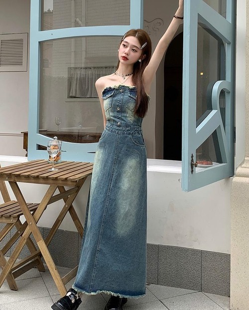 #デニム #ワンピース #ロング丈 #夏 #フリンジ #ベアトップ #大きいサイズ #体型カバー #セクシー #ダメージ加工