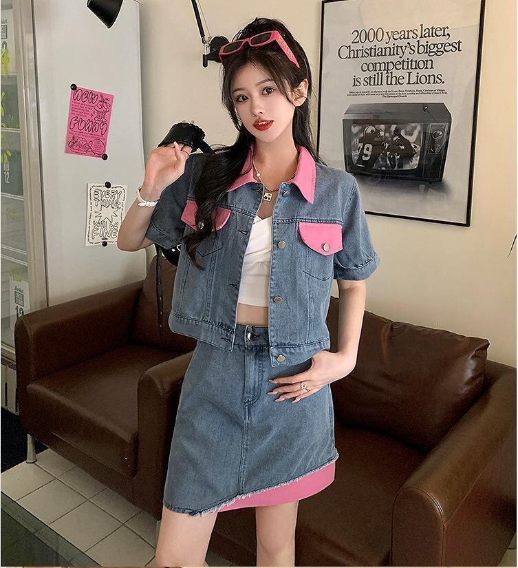 大きいサイズ レディース セットアップ デニム スカート ピンク 春夏 秋 新品 半袖 上下セット